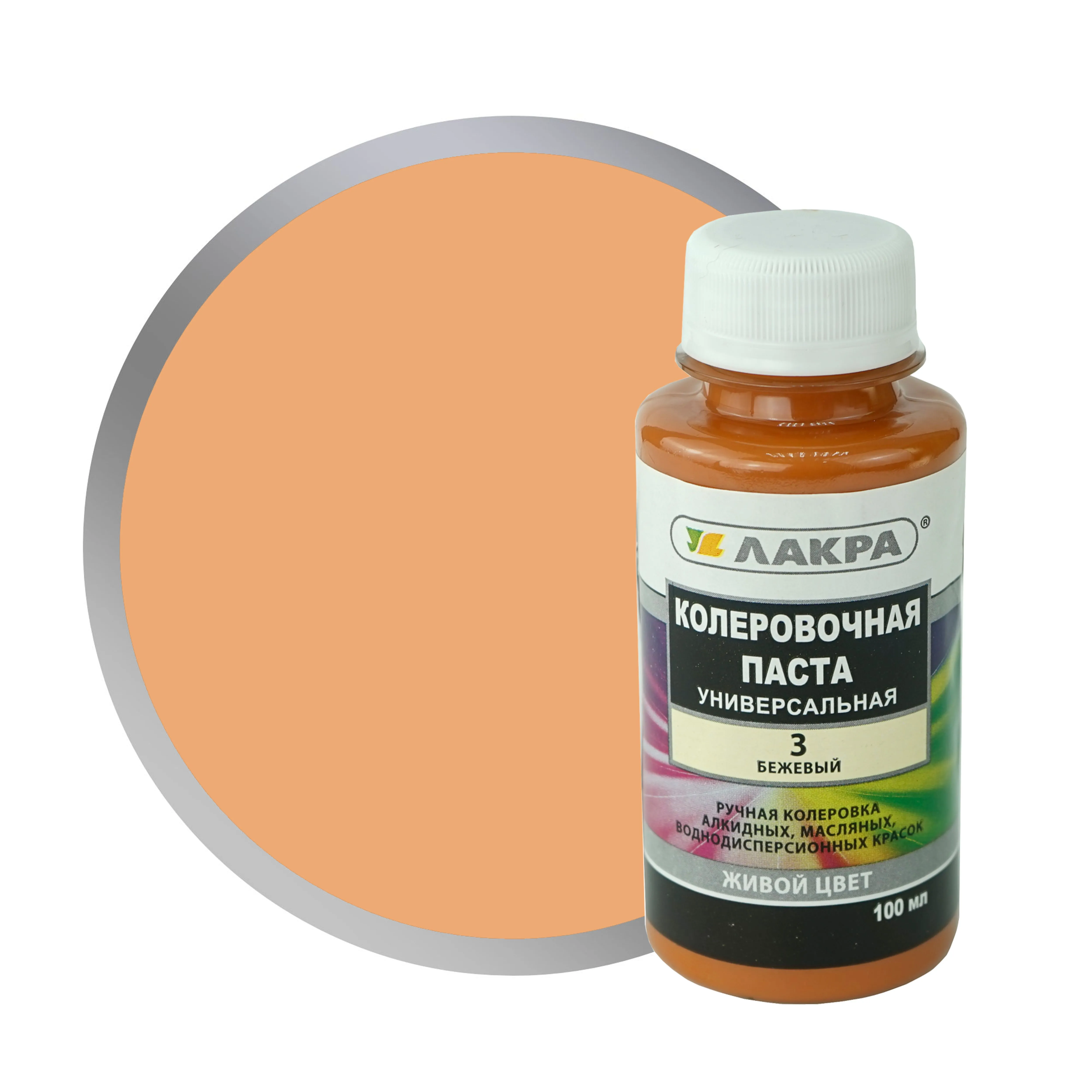 Колер-паста Лакра 03 бежевый, универсальная. Состав: Пигменты, наполнитель, этиленгликоль, технологические добавки (противоседиментационные, диспергатор, пеногаситель).