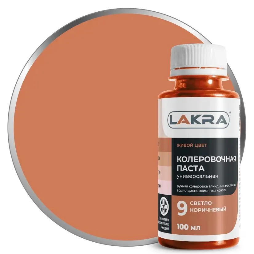 Колер-паста Лакра 09 светло-коричневый, универсальная. Состав: Пигменты, наполнитель, этиленгликоль, технологические добавки (противоседиментационные, диспергатор, пеногаситель).