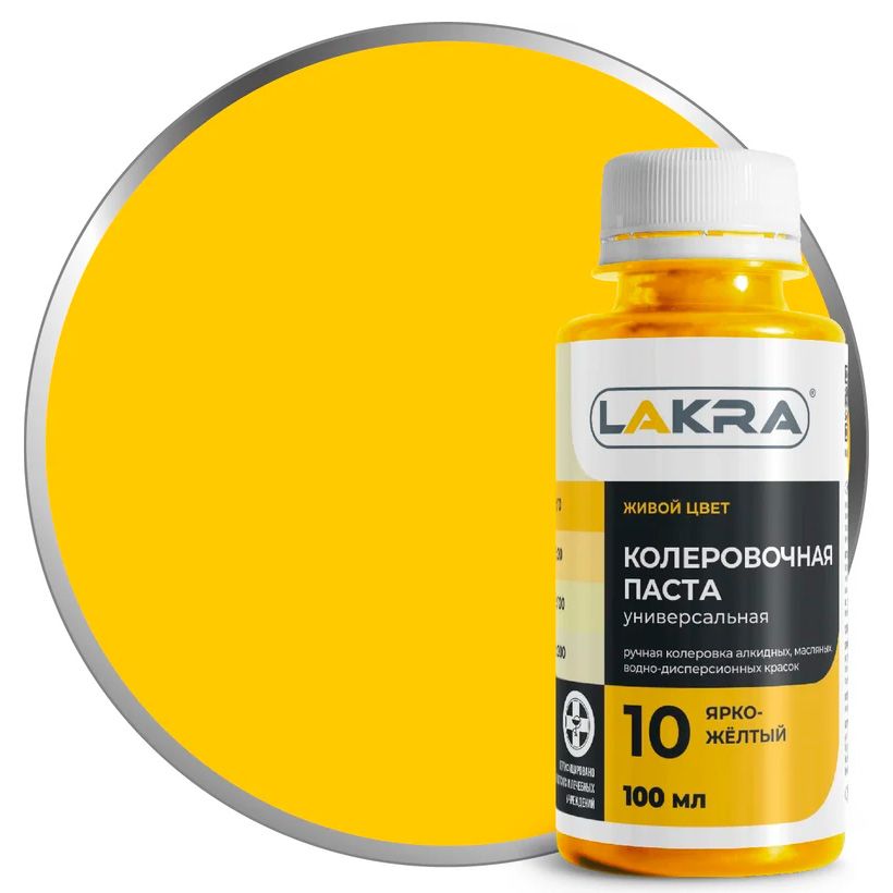 Колер-паста Лакра 10 ярко-желтый, универсальная. Состав: Пигменты, наполнитель, этиленгликоль, технологические добавки (противоседиментационные, диспергатор, пеногаситель).
