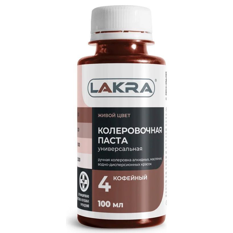 Колер-паста Лакра 04 кофейный, универсальная. Состав: Пигменты, наполнитель, этиленгликоль, технологические добавки (противоседиментационные, диспергатор, пеногаситель).
