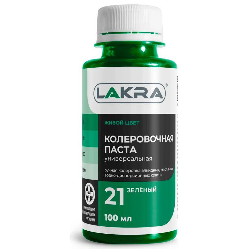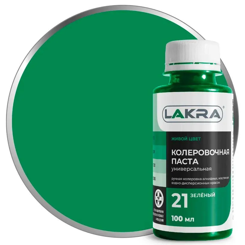 Колер-паста Лакра 21 зеленый, универсальная. Состав: Пигменты, наполнитель, этиленгликоль, технологические добавки (противоседиментационные, диспергатор, пеногаситель).