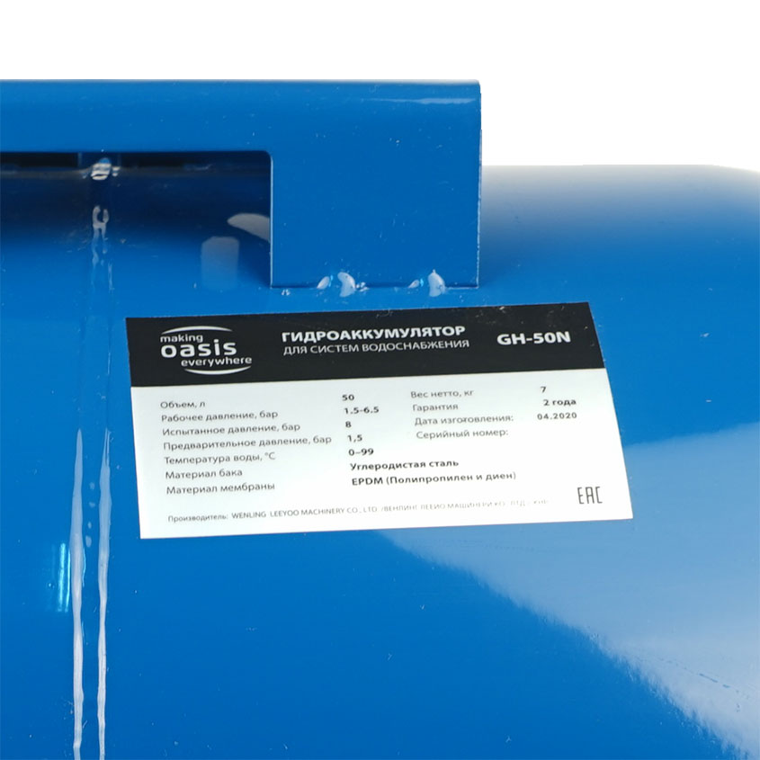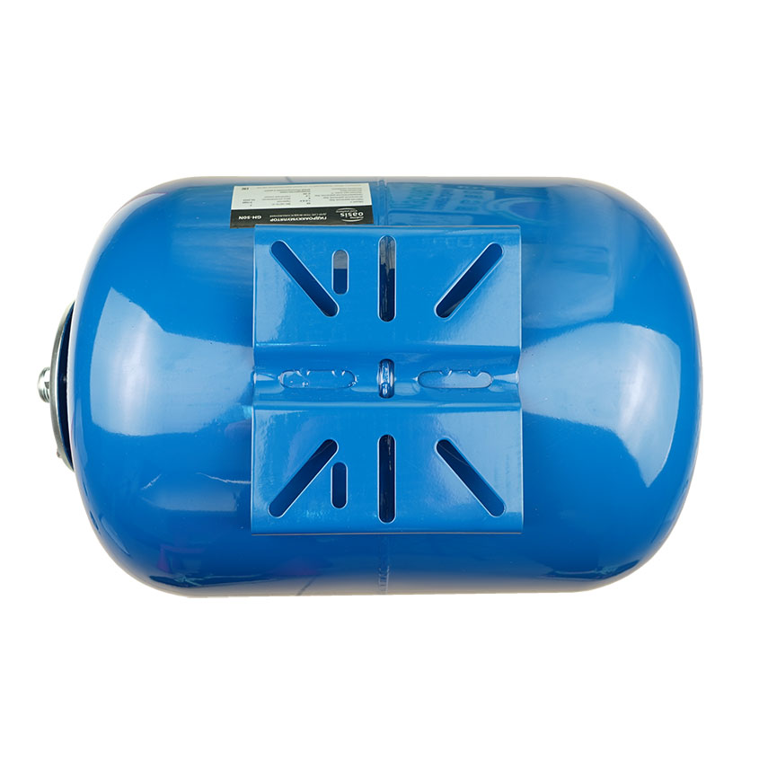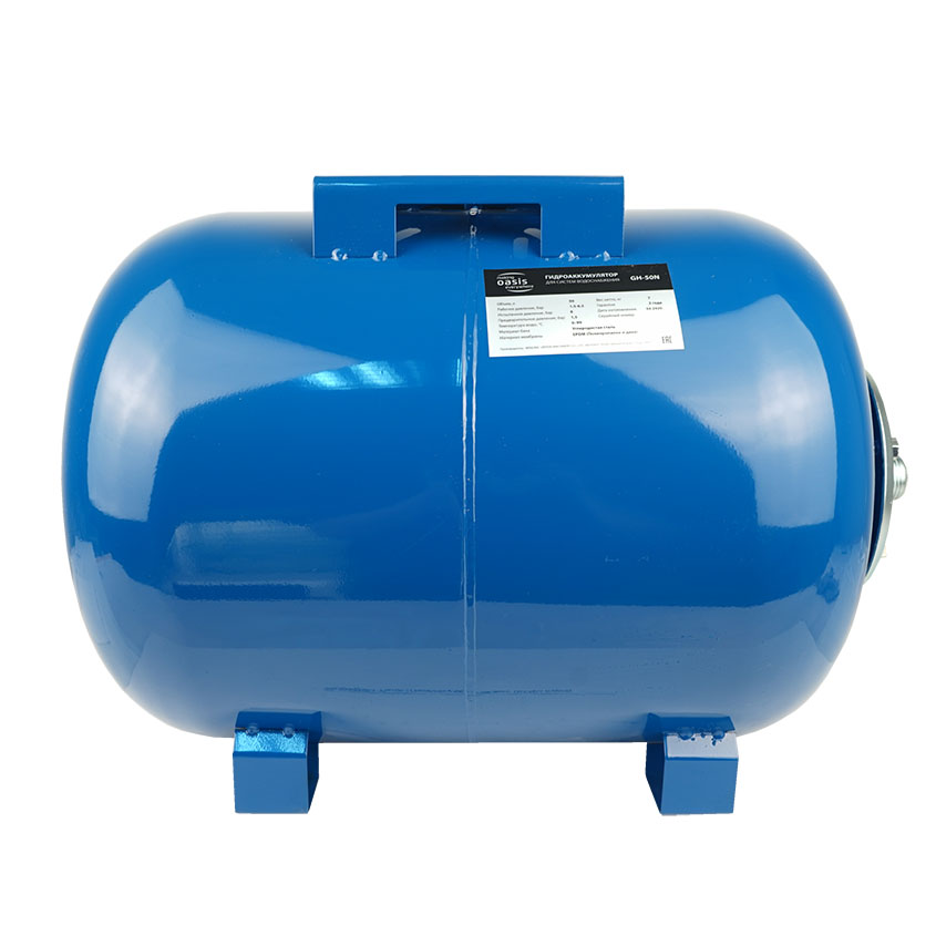 Гидравлический аккумулятор «Oasis» значительно экономит ресурс работы насоса, что в большой степени продлевает срок его службы, который может быть уменьшен частыми пусками, плохо влияющими на вращающие части насоса. Комплектуется специальной площадкой для установки подкачивающего насоса.