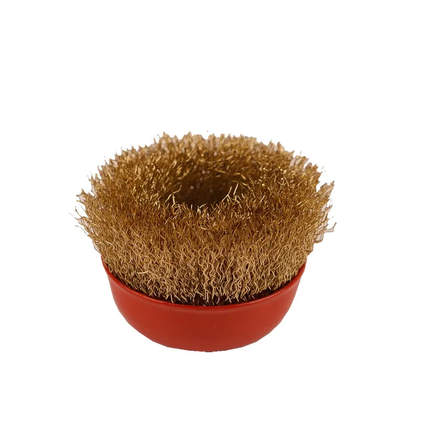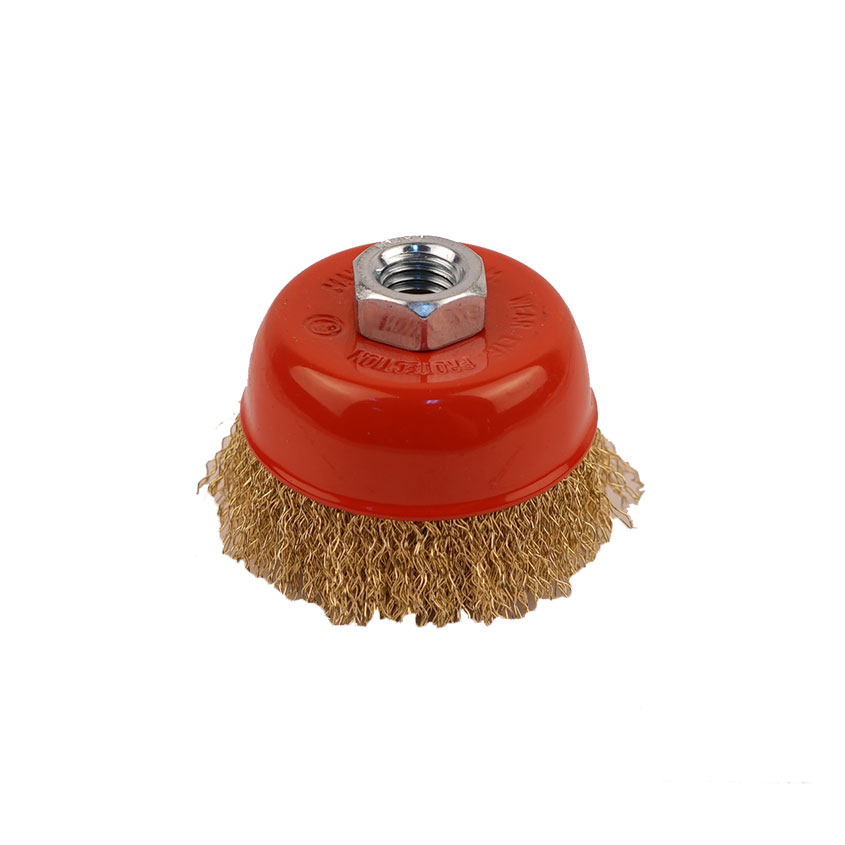 Щетка-крацовка чашечная, латунная витая проволока, 75мм Т4Р - сменный элемент для угловой шлифовальной машины. Рабочая часть состоит из стальной проволоки с латунным антикоррозийным покрытием.