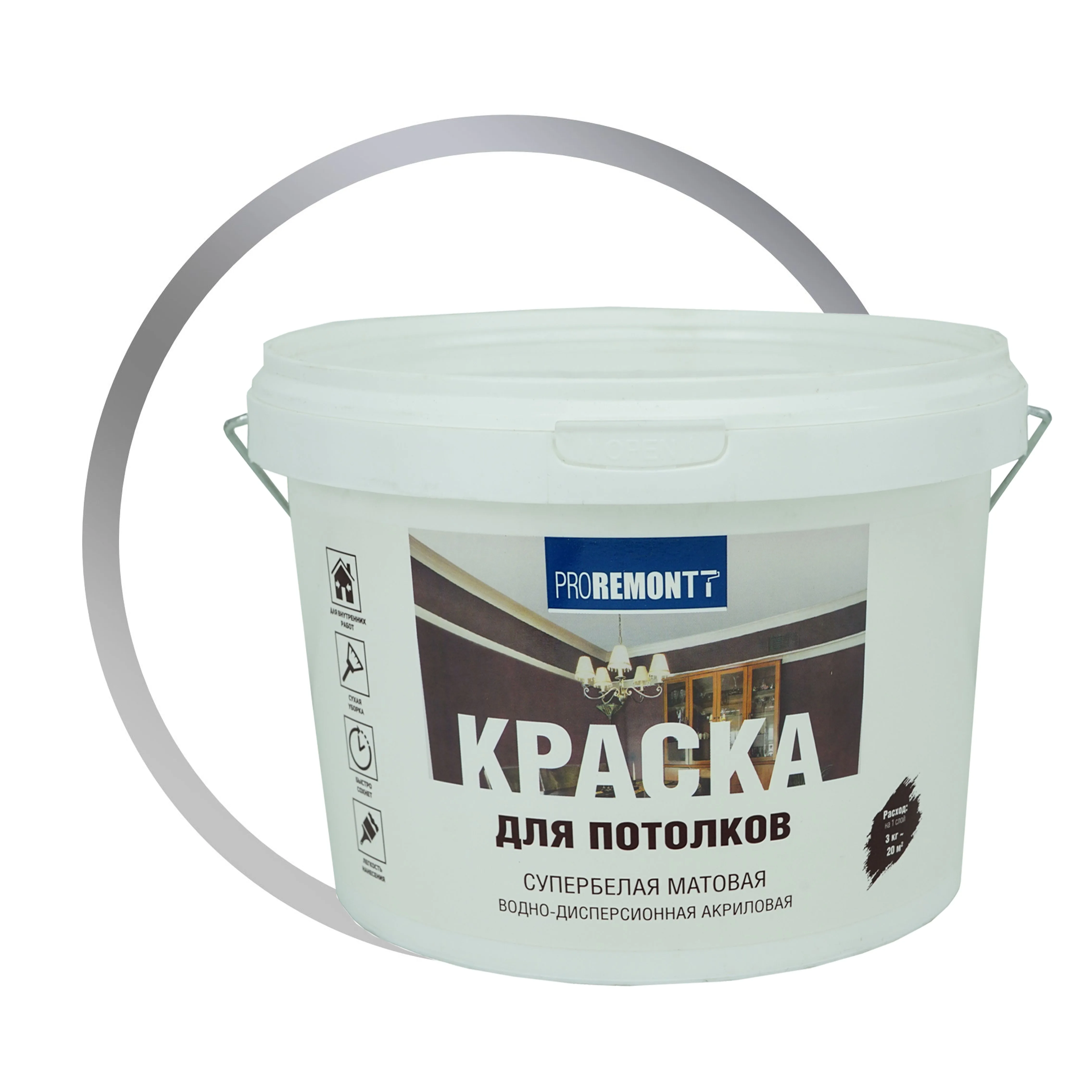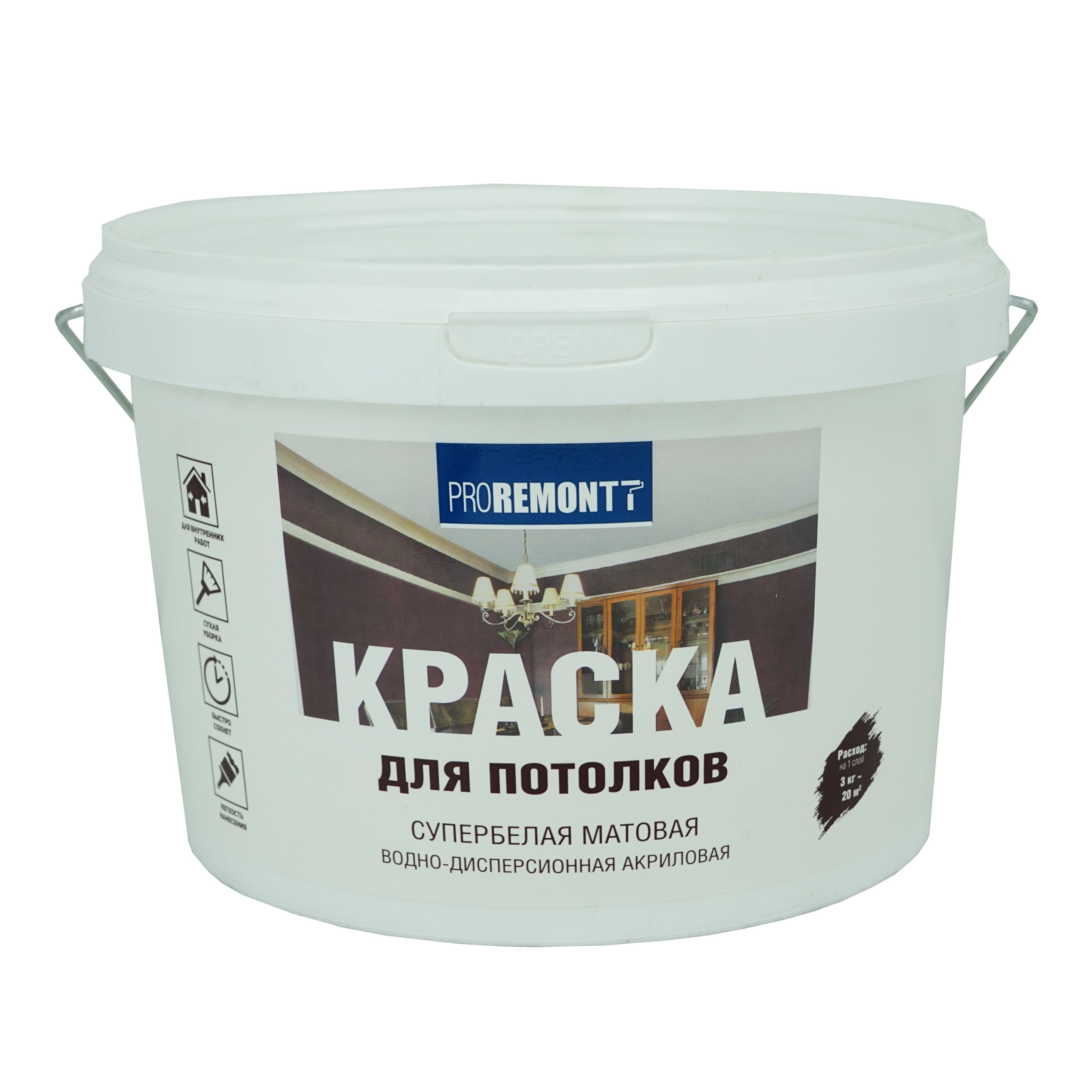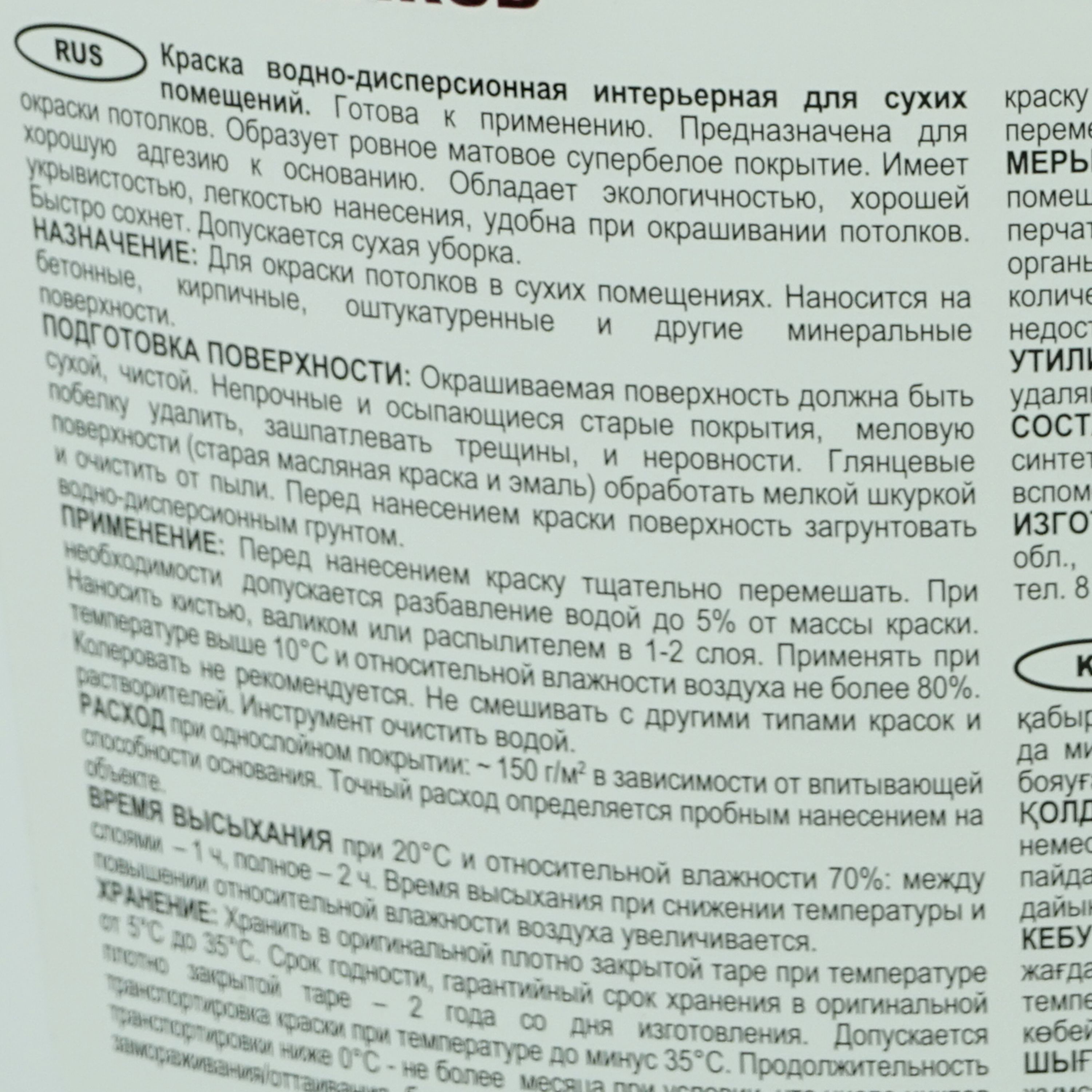 Краска водно-дисперсионная интерьерная для сухих помещений. Готова к применению. Предназначена для окраски потолков. Образует ровное матовое супербелое покрытие. Имеет хорошую адгезию к основанию. Обладает экологичностью, хорошей укрывистостью, легкостью нанесения, удобна при окрашивании потолков. Быстро сохнет. Допускается сухая уборка.
