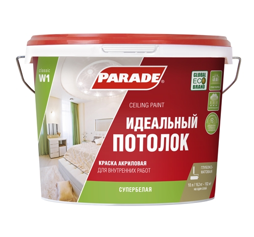 - Белая акриловая краска Parade W1 для потолков используемая в сухих помещениях таких как гостиные и спальни жилых домов.