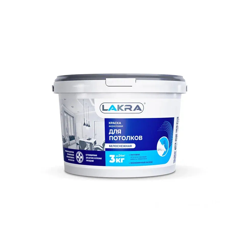 Белая краска Лакра для потолков используется в помещениях, не подвергающихся сильным эксплуатационным нагрузкам.