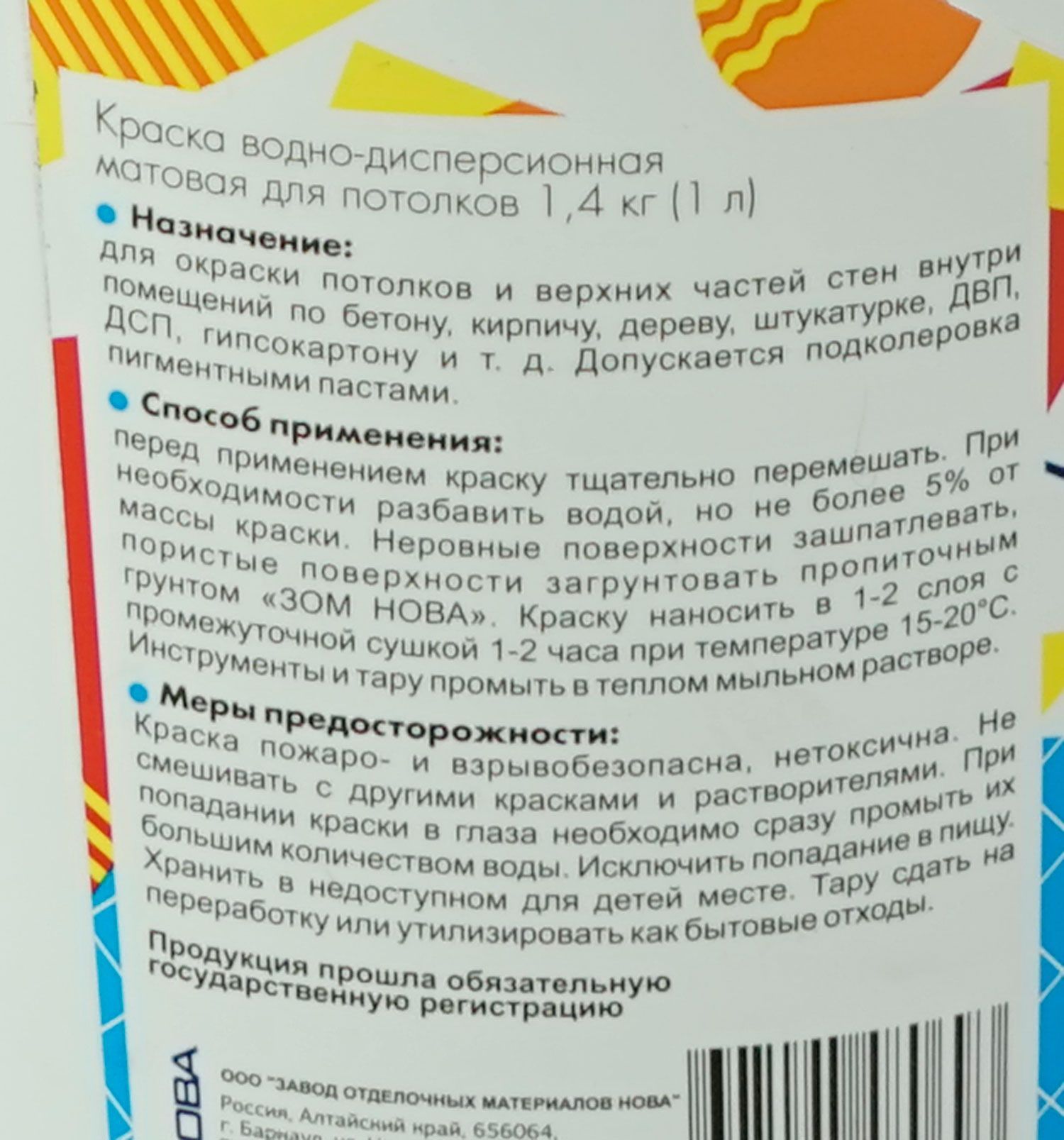 Латексная краска для потолков и верхних частей стен в жилых и административных помещениях по бетону, кирпичу, дереву, штукатурке, ДВП, ДСП, гипсокартону и т.д. Имеет хорошую укрывистость, матовое покрытие. Улучшенные свойства и белизна. Допускается подколеровка пигментными пастами.