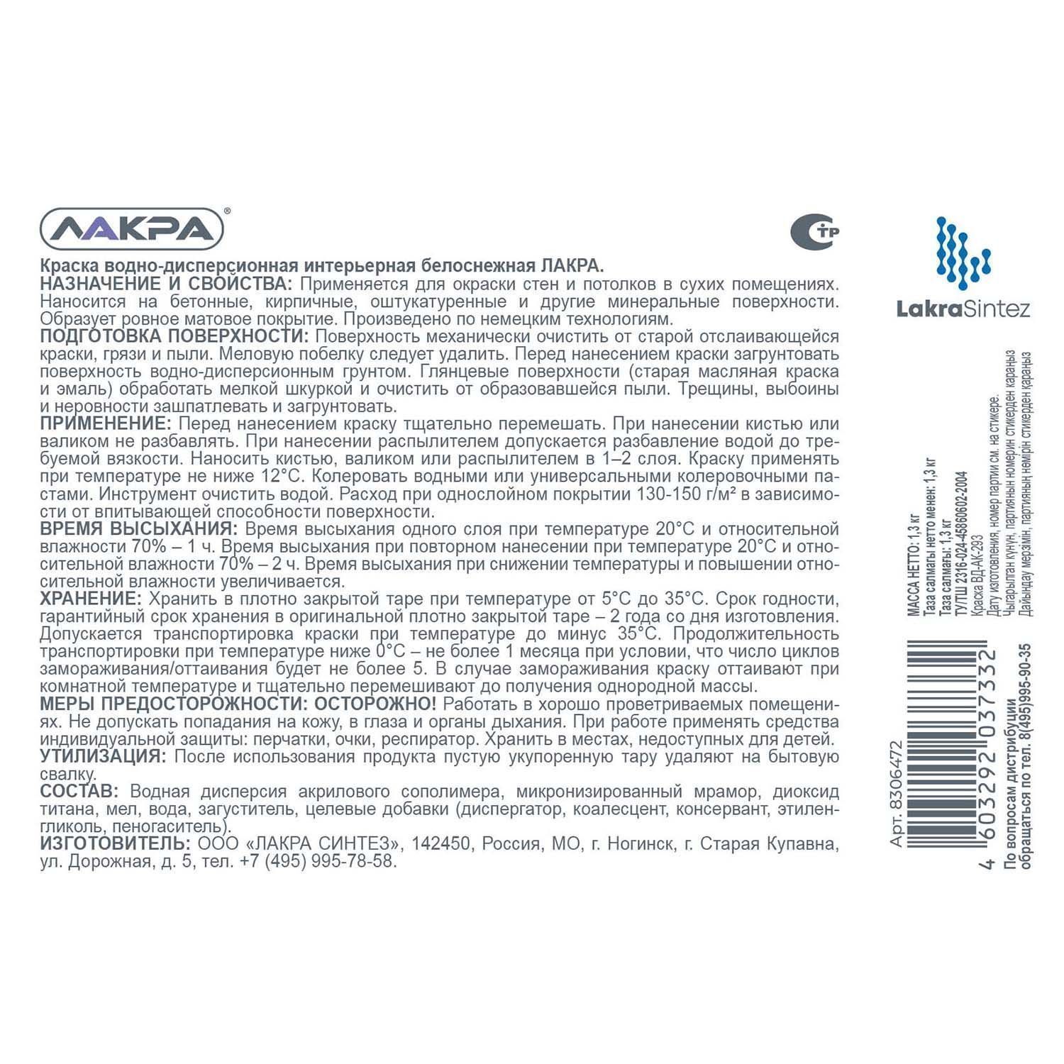 Срок хранения краски 12 месяцев при температуре от +5°C до +35°C в плотно закрытой таре. Выдерживает 5 циклов замораживания до -40°C. В связи с этим Лакра считается морозоустойчивой и допускает транспортировку при -40°C.