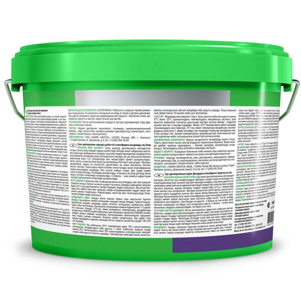 Хранить в плотно закрытой таре при температуре от 5°С до 35°С. Гарантийный срок хранения в оригинальной плотно закрытой таре – 2 года со дня изготовления. Допускается транспортировка краски при температуре до минус 35°С. Продолжительность транспортировки при температуре ниже 0°С – не более 1 месяца при условии, что число циклов замораживания/оттаивания будет не более 5. В случае замораживания краску оттаивают при комнатной температуре и тщательно перемешивают до получения однородной массы.