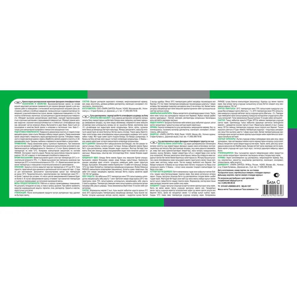 - Выпускается в двух базах. База А для использования в качестве белой краски и колеровки в пастельные тона. База С - только для компьютерной колеровки в темные или насыщенные тона