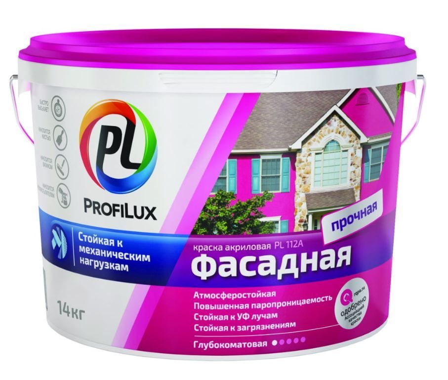 Фасадная влагостойкая краска Profilux предназначена для защитно-декоративного окрашивания минеральных оснований (бетон, кирпич) внутри и снаружи помещений. Состав быстро сохнет и отличается высокой укрывистостью.