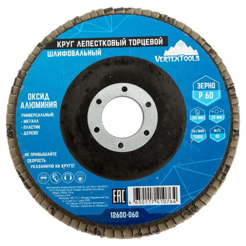 Круг лепестковый (Vertextools) торцевой, Р60, 125х22мм (12600-060) цена - купить в Барнауле, Бийске. Размеры, характеристики, фото в интернет-магазине.
