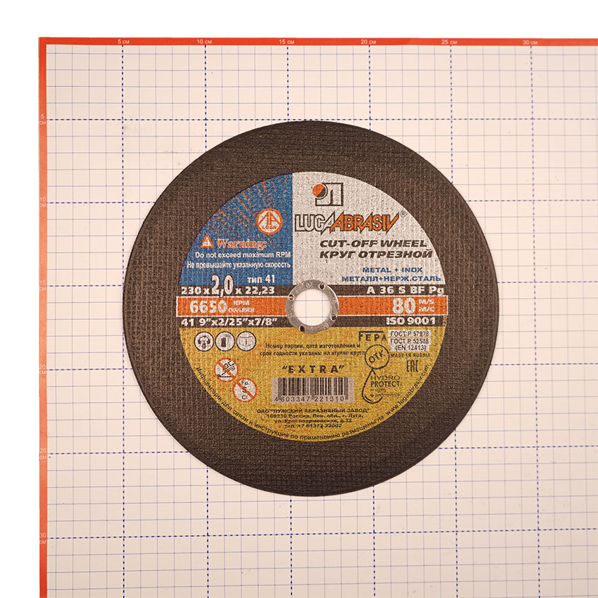 Круг отрезной абразивный ЛУГА по металлу 230х2х22- расходный сменный элемент для УШМ изготовлен из электрокорунда нормального марки 14А на основе бакелитовой связки с армированием.