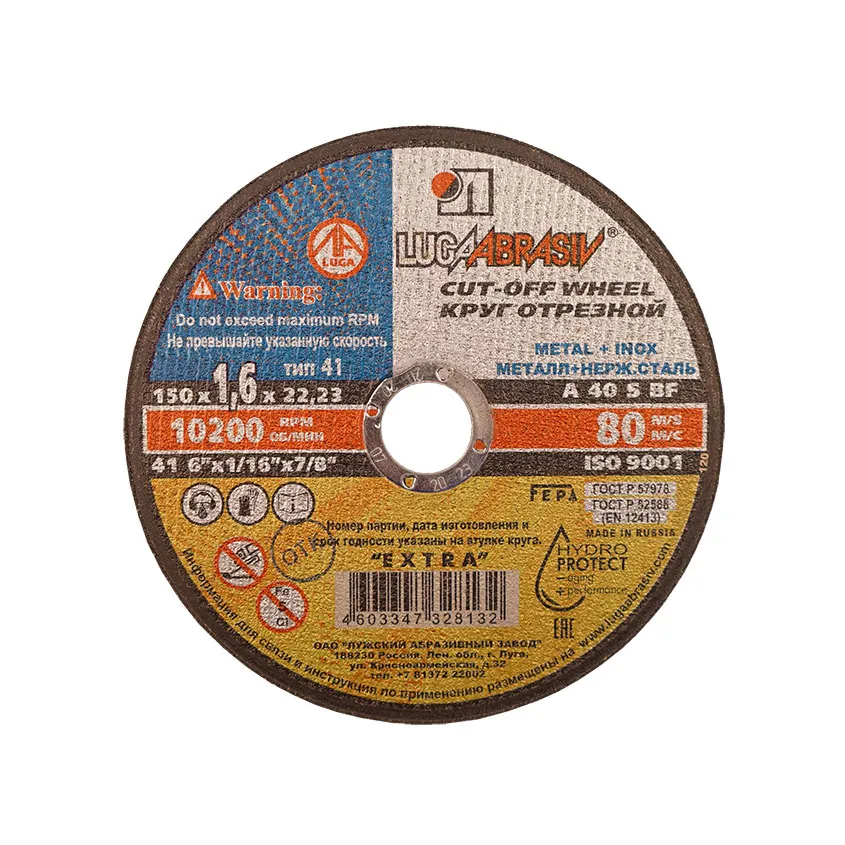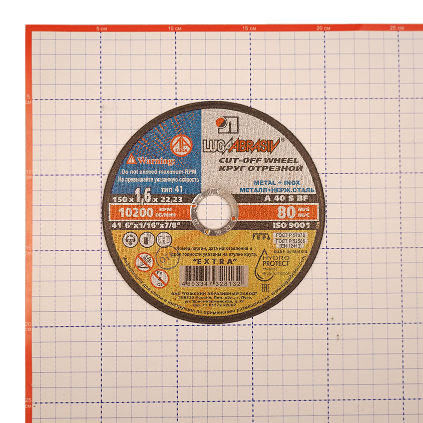 Круг отрезной абразивный ЛУГА по металлу 150х1,6х22 - расходный сменный элемент для УШМ изготовлен из электрокорунда нормального марки 14А на основе бакелитовой связки с армированием.