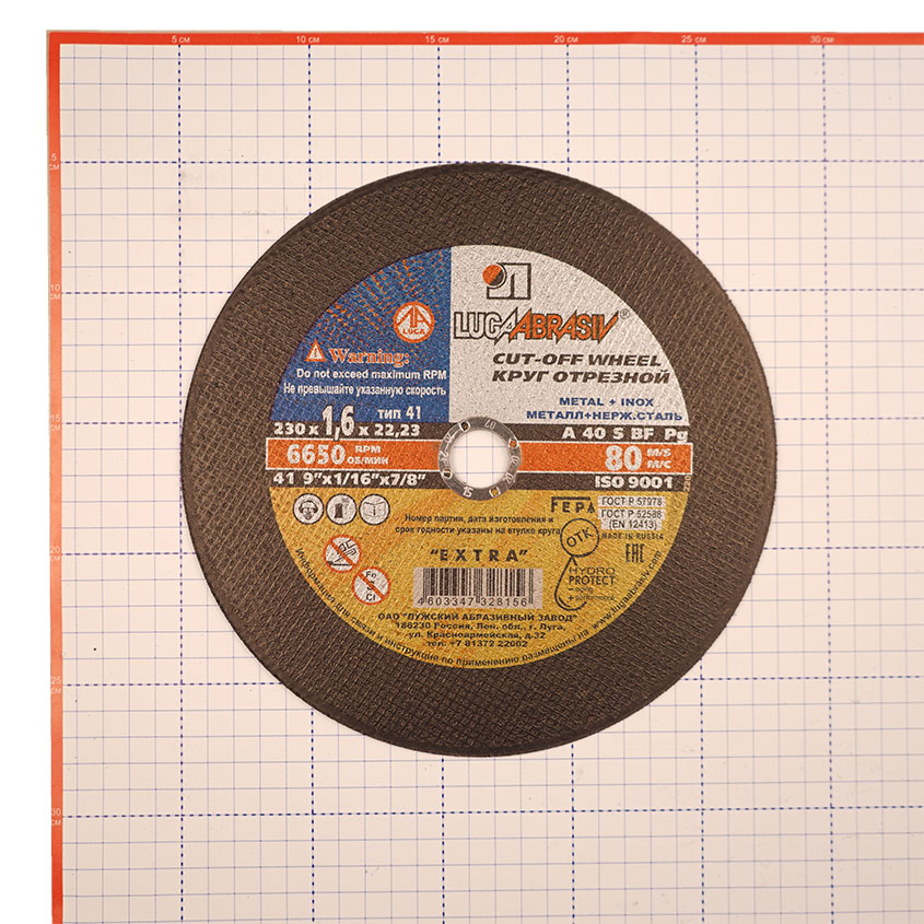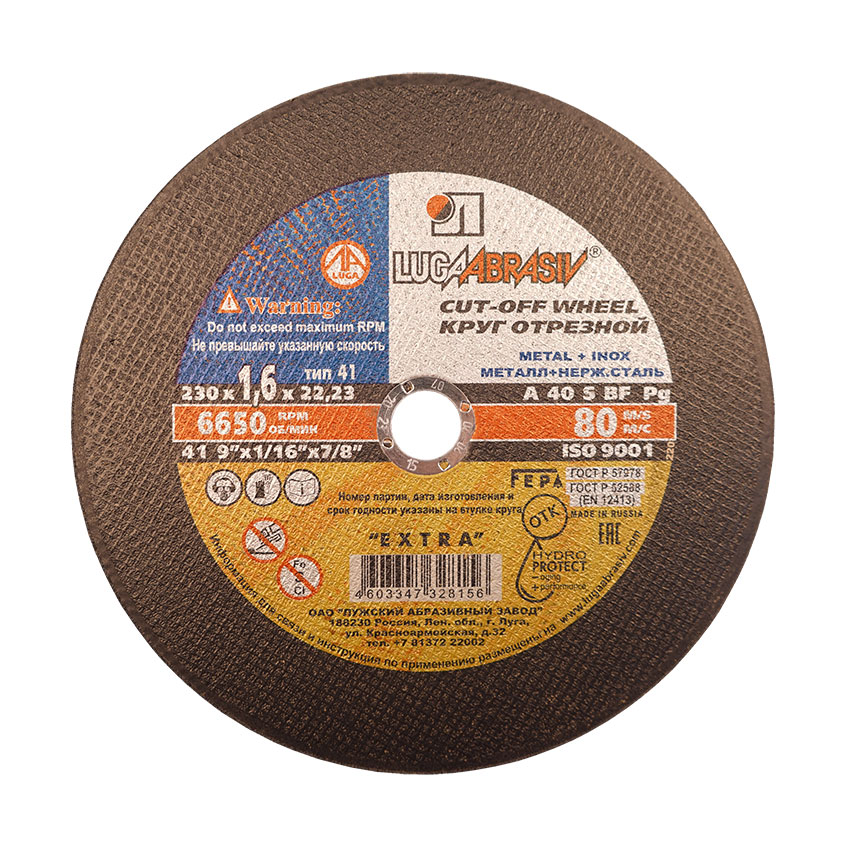 Круг отрезной абразивный ЛУГА по металлу 230х1,6х22- расходный сменный элемент для УШМ изготовлен из электрокорунда нормального марки 14А на основе бакелитовой связки с армированием.