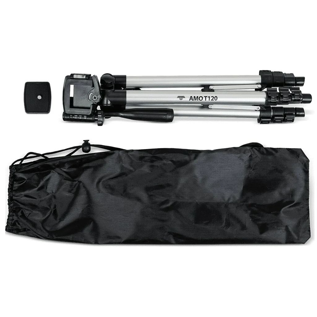 - За счет малого веса треногу легко перемещать в процессе ремонта. В сложенном состоянии штатив AMO T120 компактен и без проблем умещается в сумку или рюкзак. Удобный комплектный чехол упрощает транспортировку и хранение.
