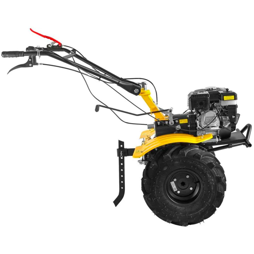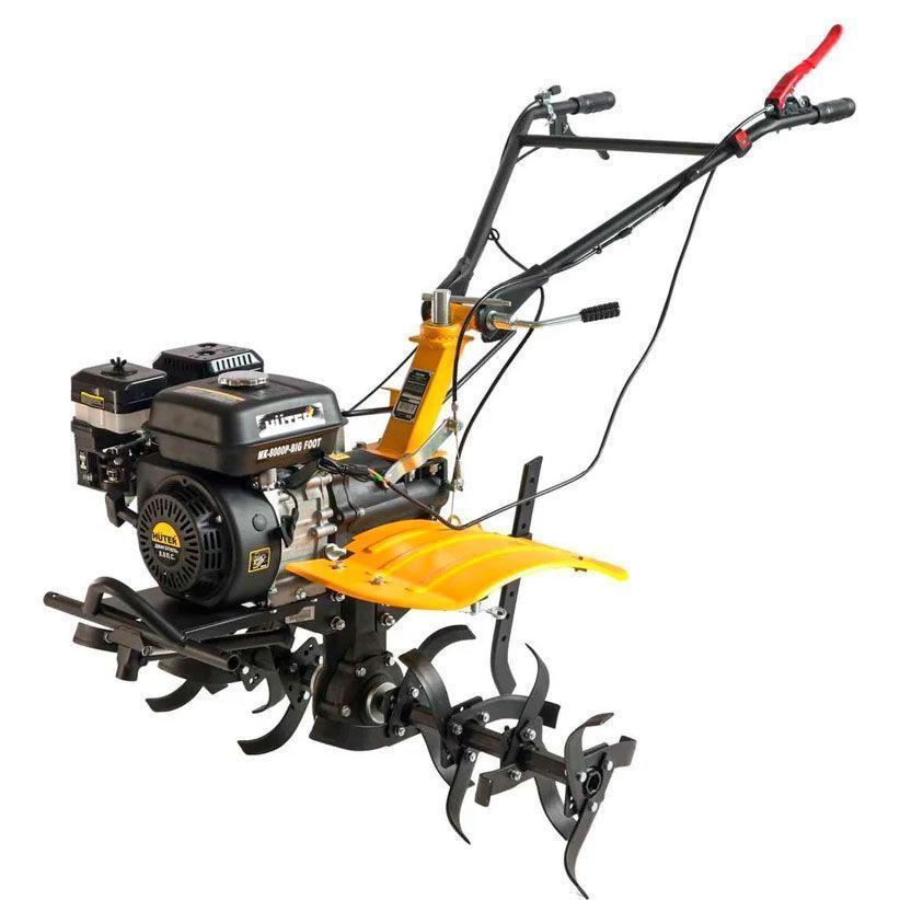 Ключевым отличием HUTER MK-8000P BF от аналогов с такой же мощностью является наличие больших колёс 19х7-8 с агрессивным протектором, которые обеспечивают хорошую проходимость. Мотоблок имеет две передачи вперёд и одну назад, что позволяет обрабатывать сложные участки почвы, включая целину, минимизировать застревания и хорошо маневрировать. Ширина обработки составляет 100 см. Глубина регулируется сошником. Диаметр фрез – 30 см.