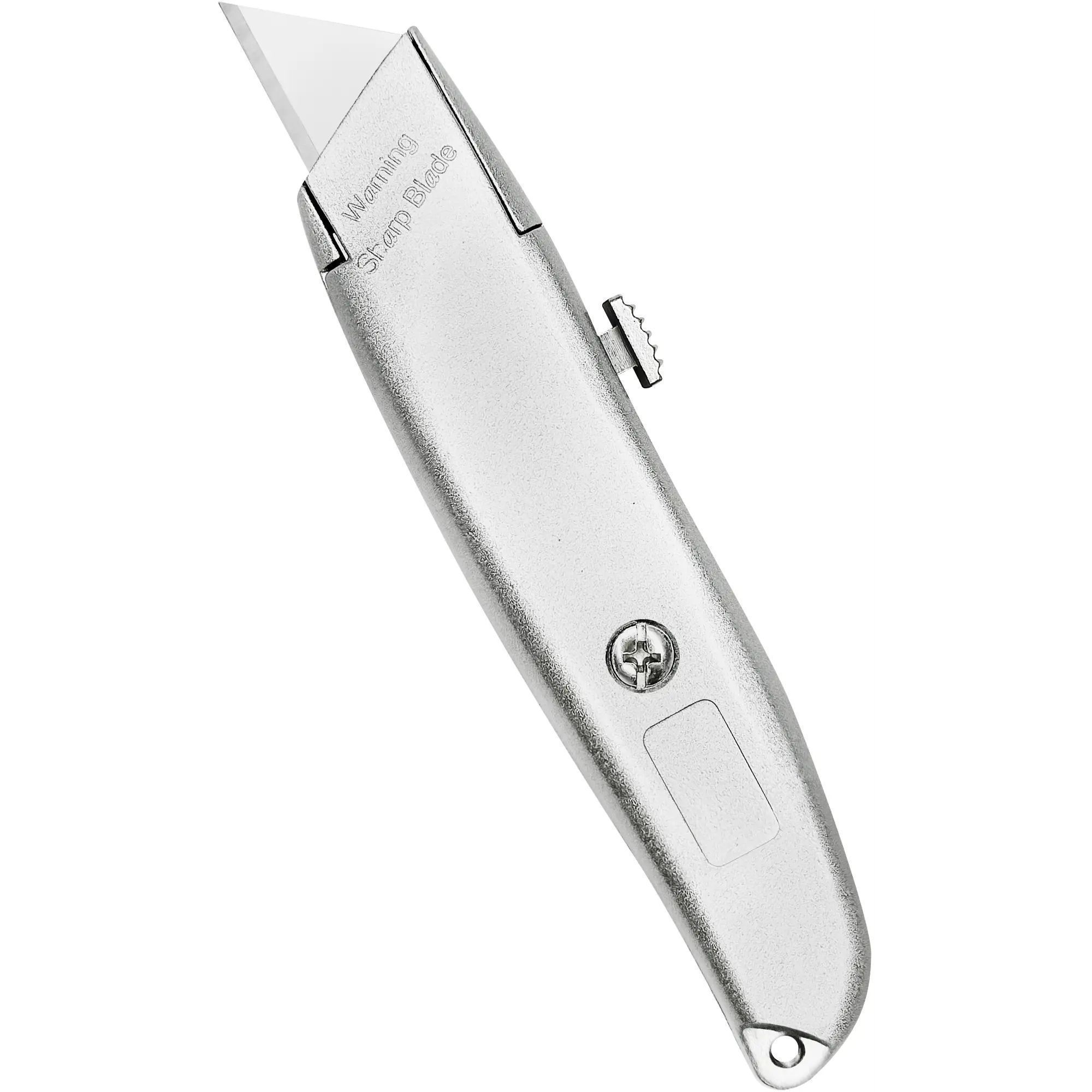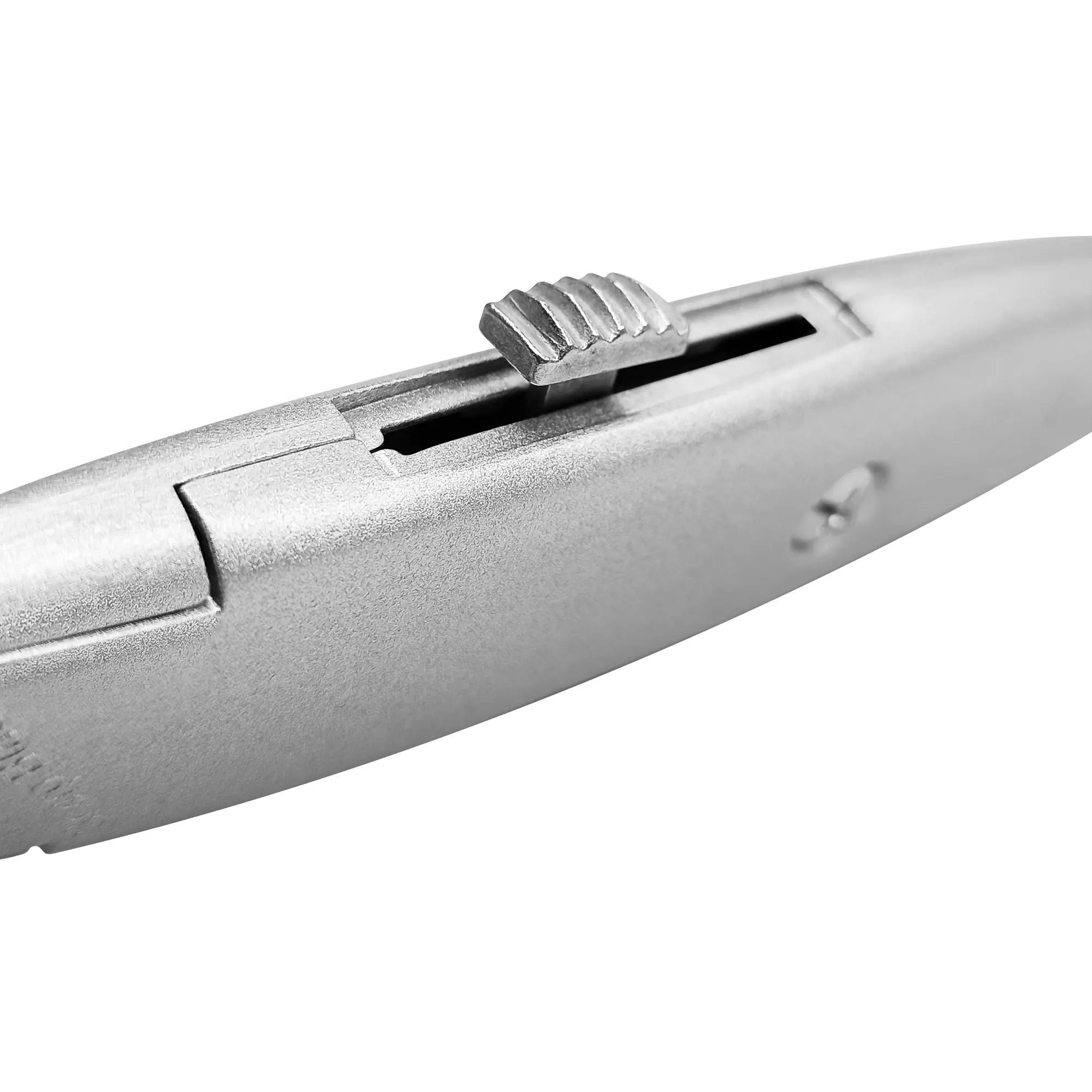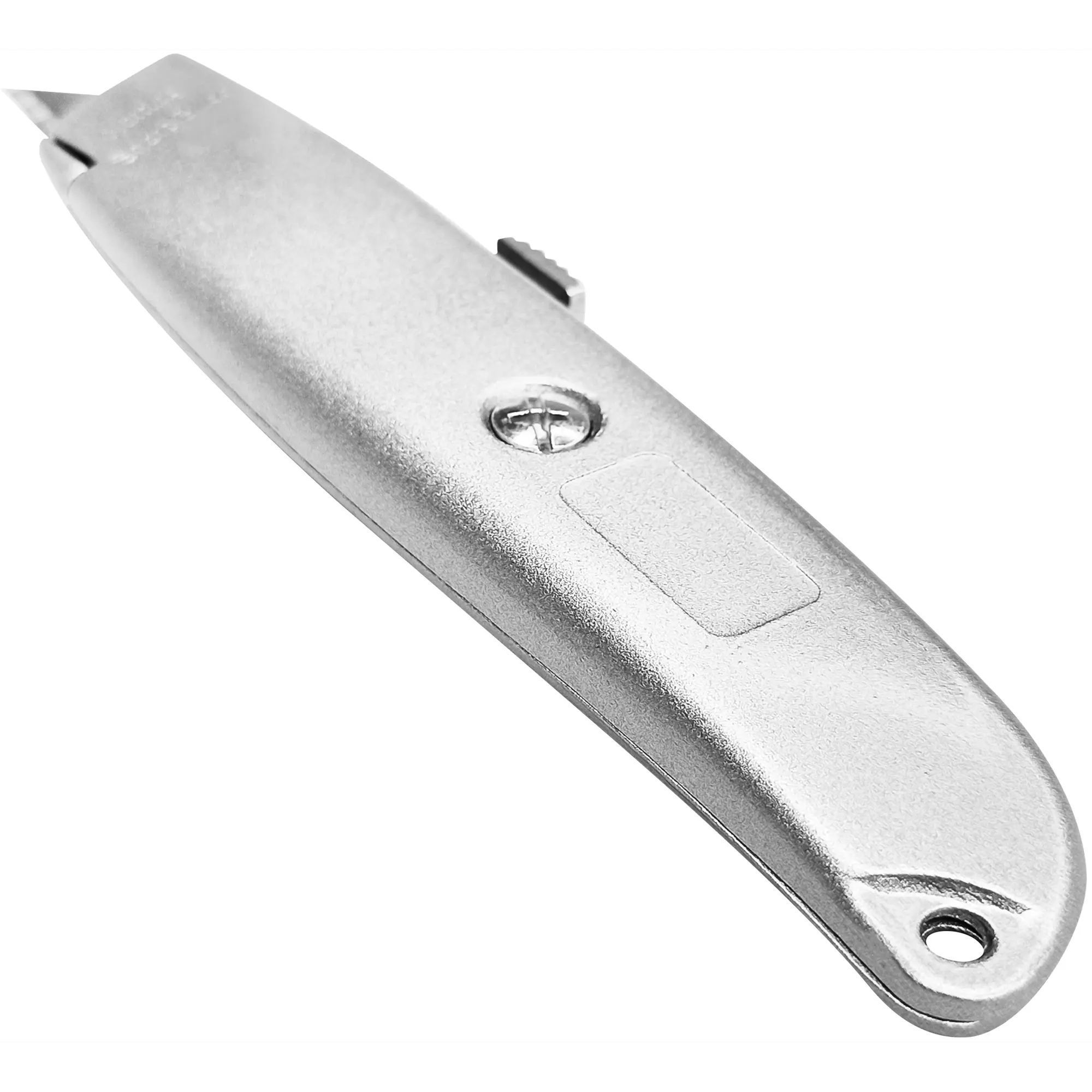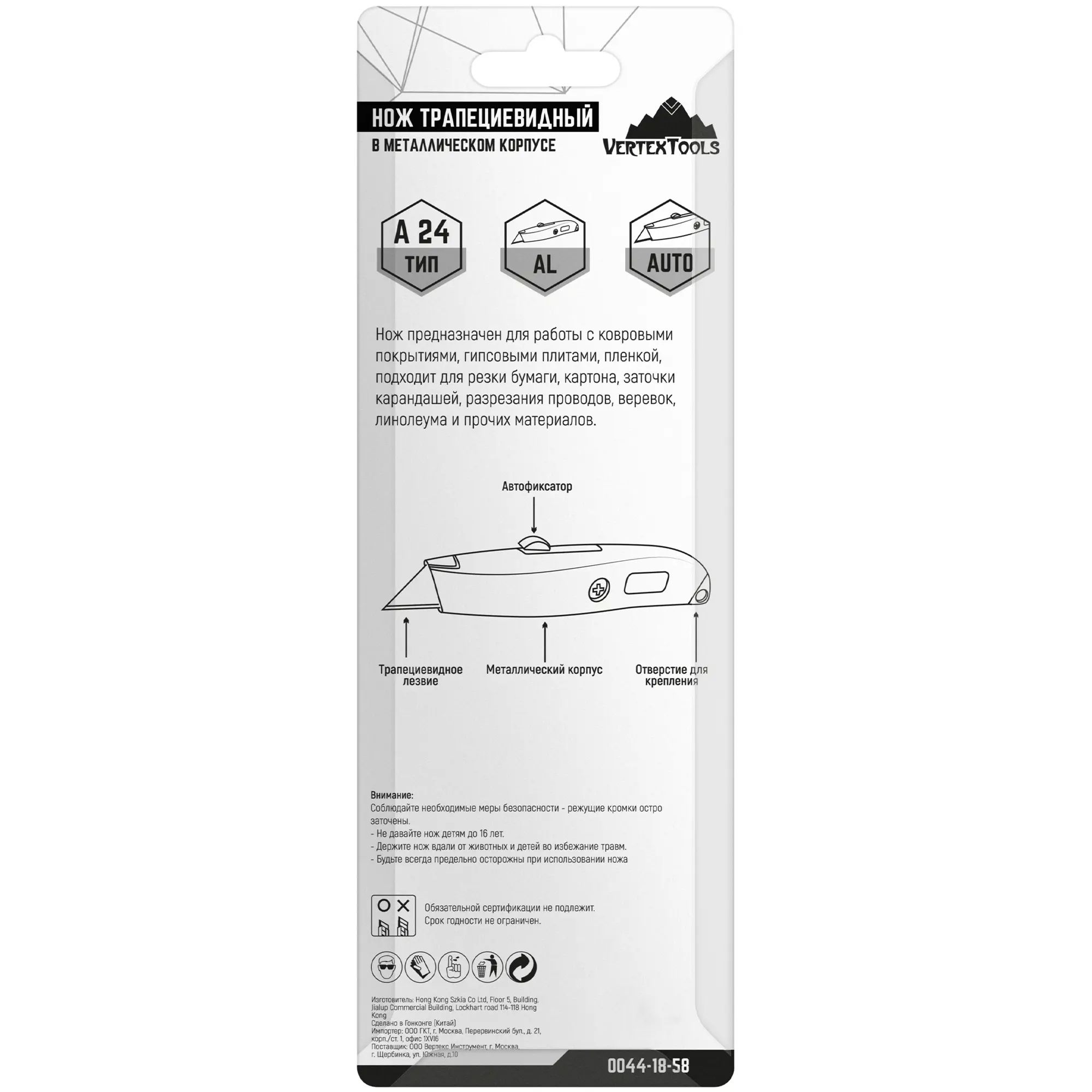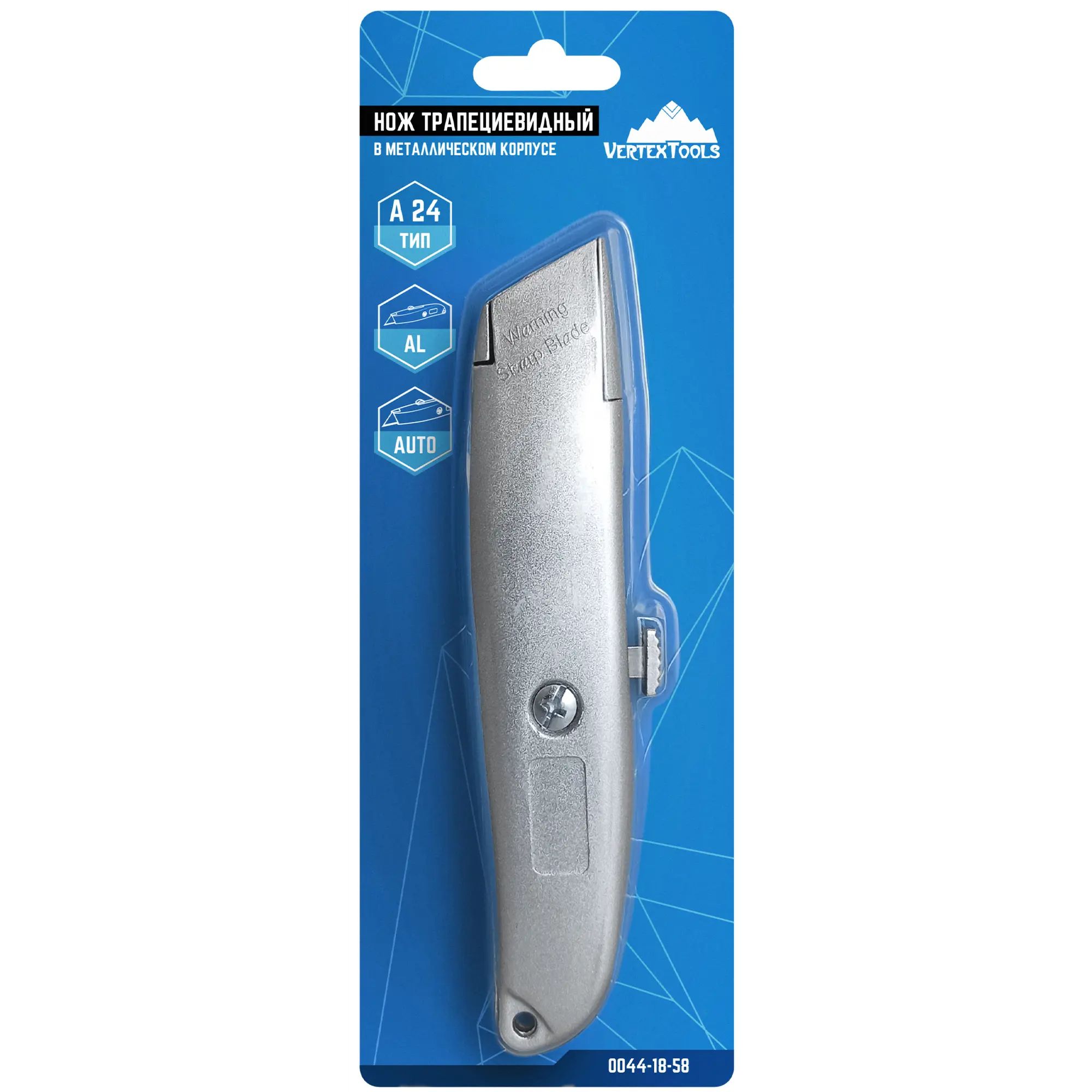 Нож строительный Vertextools 0044-18-58 оснащен выдвижным трапециевидным лезвием, находящимся в прочном и легком алюминиевом корпусе. Для удобства работы и безопасности пользователя предусмотрена кнопка фиксации лезвия в одном положении. Замена лезвия осуществляется при помощи винта, расположенного на корпусе.