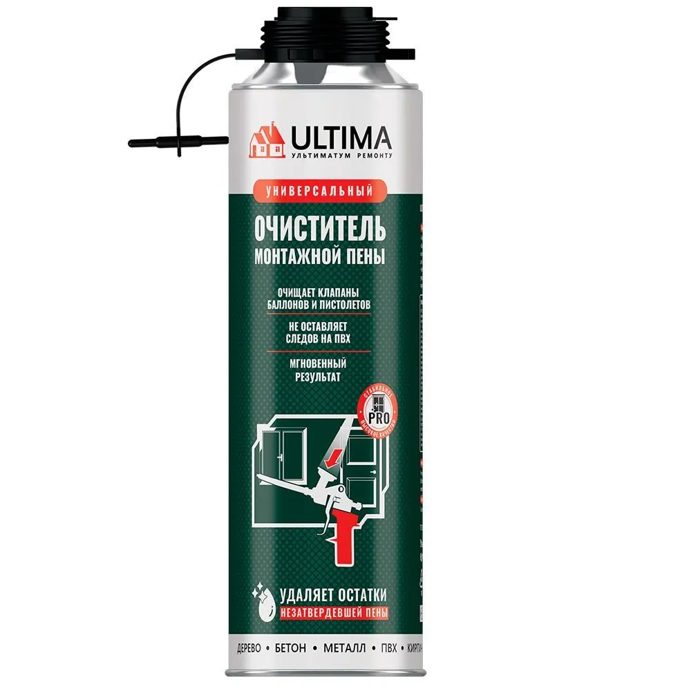 Очиститель свежей монтажной пены ULTIMA - представляет собой смесь органического растворителя с пропиленом в аэрозольном баллоне, выпускаемая с помощью распылителя.
