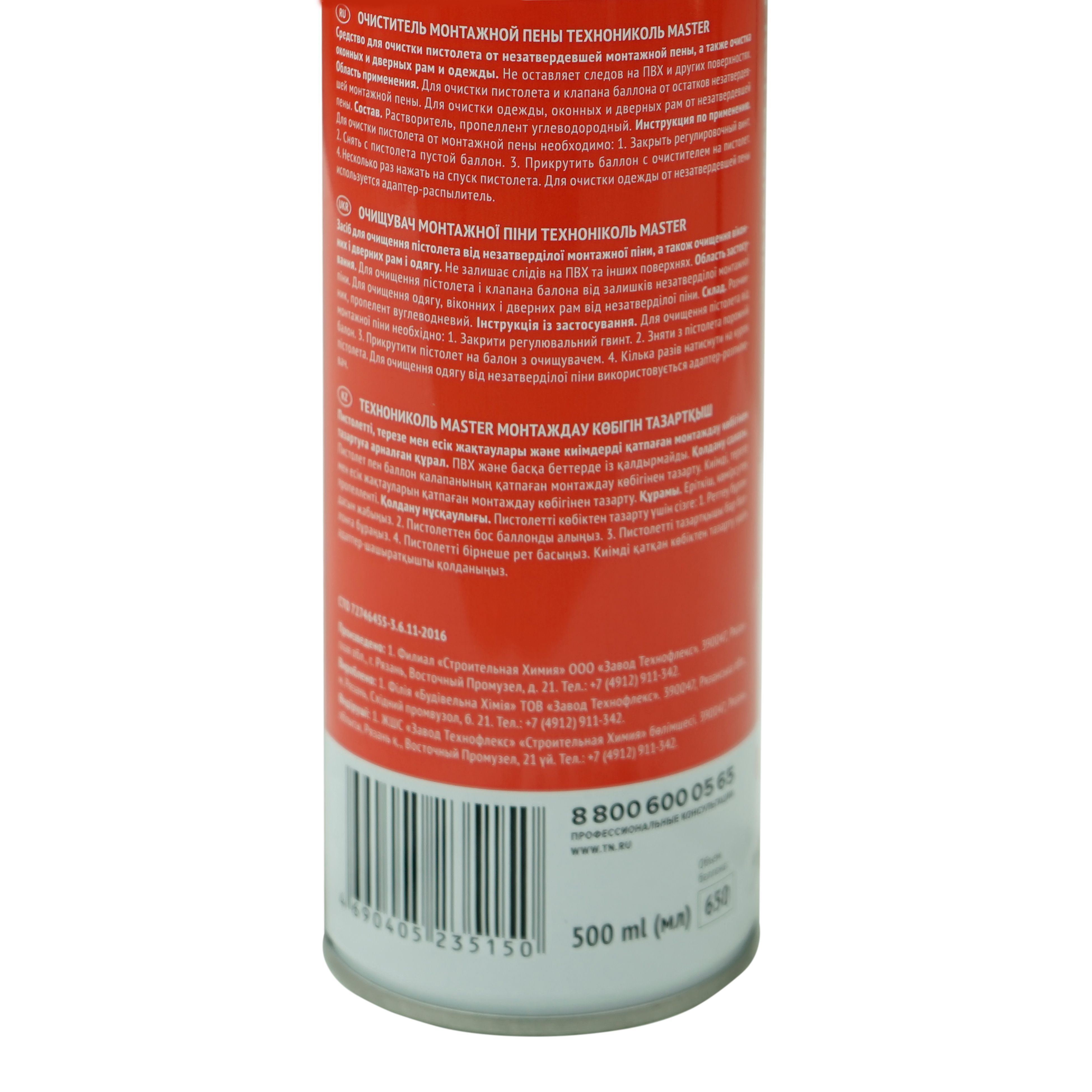 Очиститель монтажной пены ТехноНИКОЛЬ - представляет собой смесь органического растворителя с пропиленом в аэрозольном баллоне, выпускаемая с помощью распылителя.