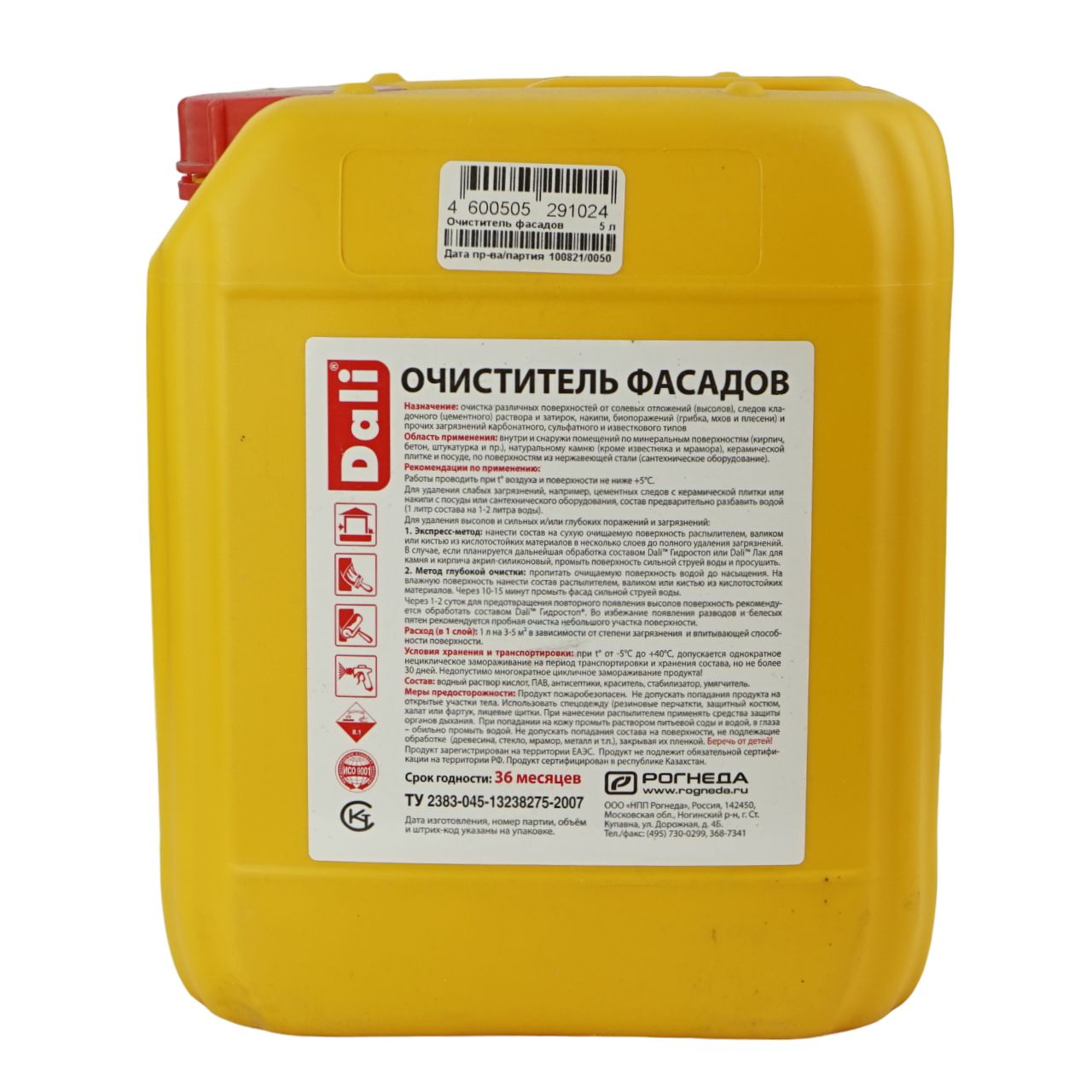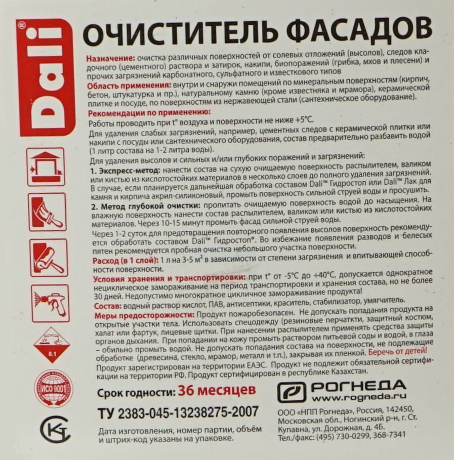 Средство Dali (Дали) для очистки фасадов против солевых отложений и цементных остатков с минеральных поверхностей, а также имеющихся биопоражений (плесени, грибка и т. п.).