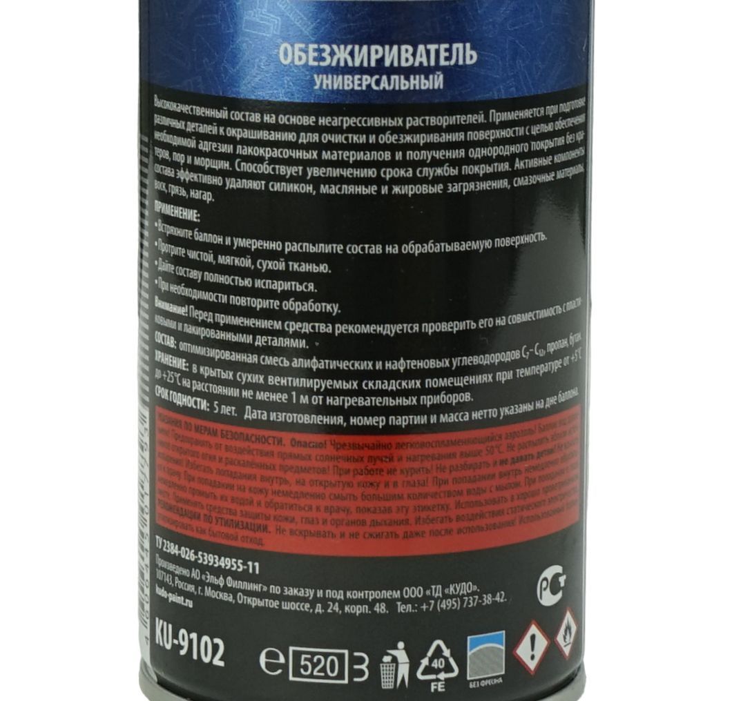 Высококачественный состав на основе неагрессивных растворителей. Обезжириватель KUDO® KU-9102 применяется при подготовке различных деталей к окрашиванию для очистки и обезжиривания поверхности с целью обеспечения необходимой адгезии лакокрасочных материалов и получения однородного покрытия без кратеров, пор и морщин. Способствует увеличению срока службы покрытия. Активные компоненты состава эффективно удаляют силикон, масляные и жировые загрязнения, смазочные материалы, воск, грязь, нагар.