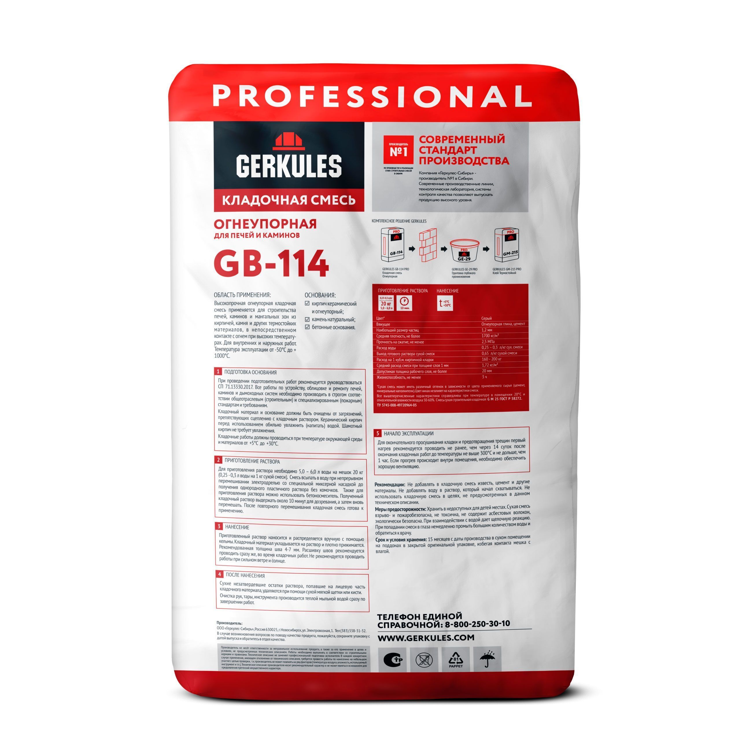 Состав огнеупорной кладочной смеси GB-114: цемент, фракционированный кварцевый песок , огнеупорная глина, модифицированные порошковые добавки водорастворимых полимеров ведущих европейских производителей.