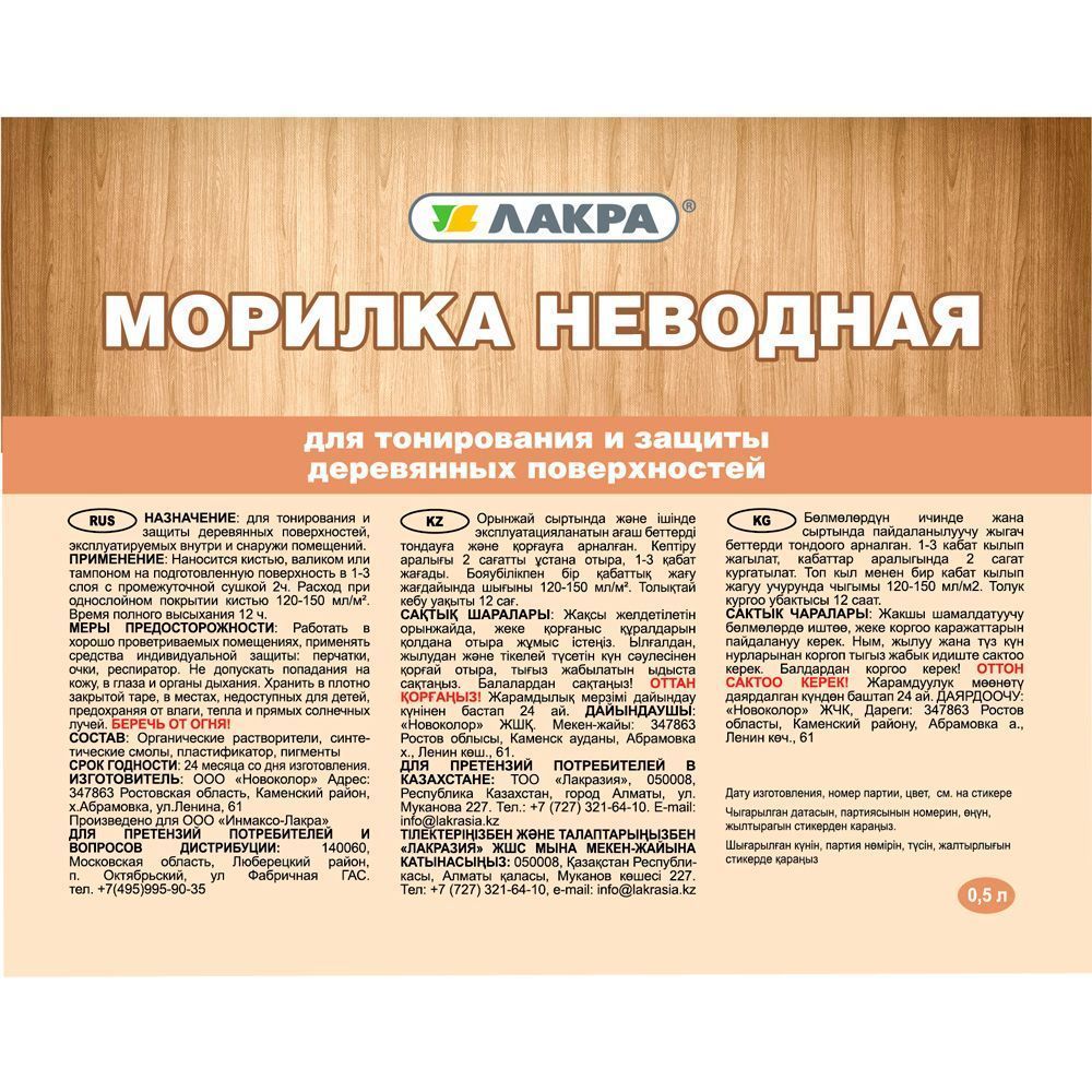 Неводная морилка Лакра 0,5 л используется для обработки изделий из дерева с целью защиты их поверхности. Покрытие быстро высыхает, отлично полируется и отличается устойчивостью к условиям внешней среды. Подходит для тонирования неровных поверхностей.