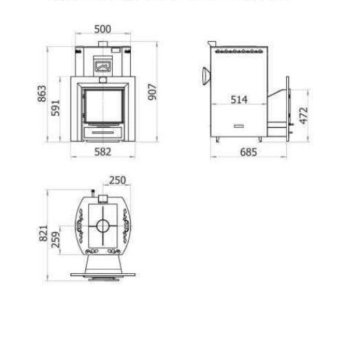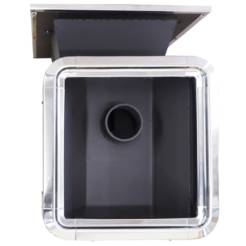 - Патрубок дымохода смещен вперед, что дает больше удобств при размещении камней в пространстве каменки и создает более комфортные условия в процессе парения;
