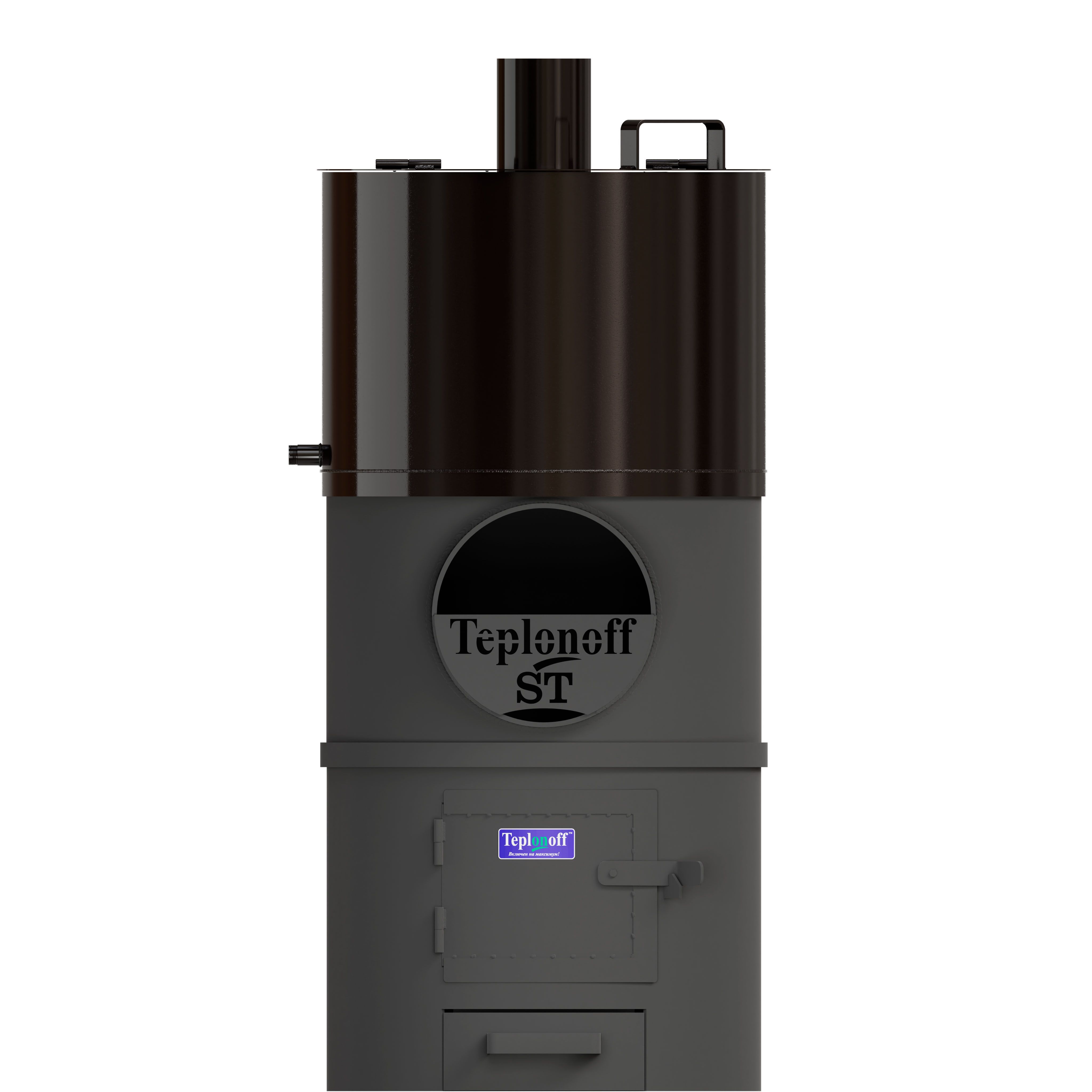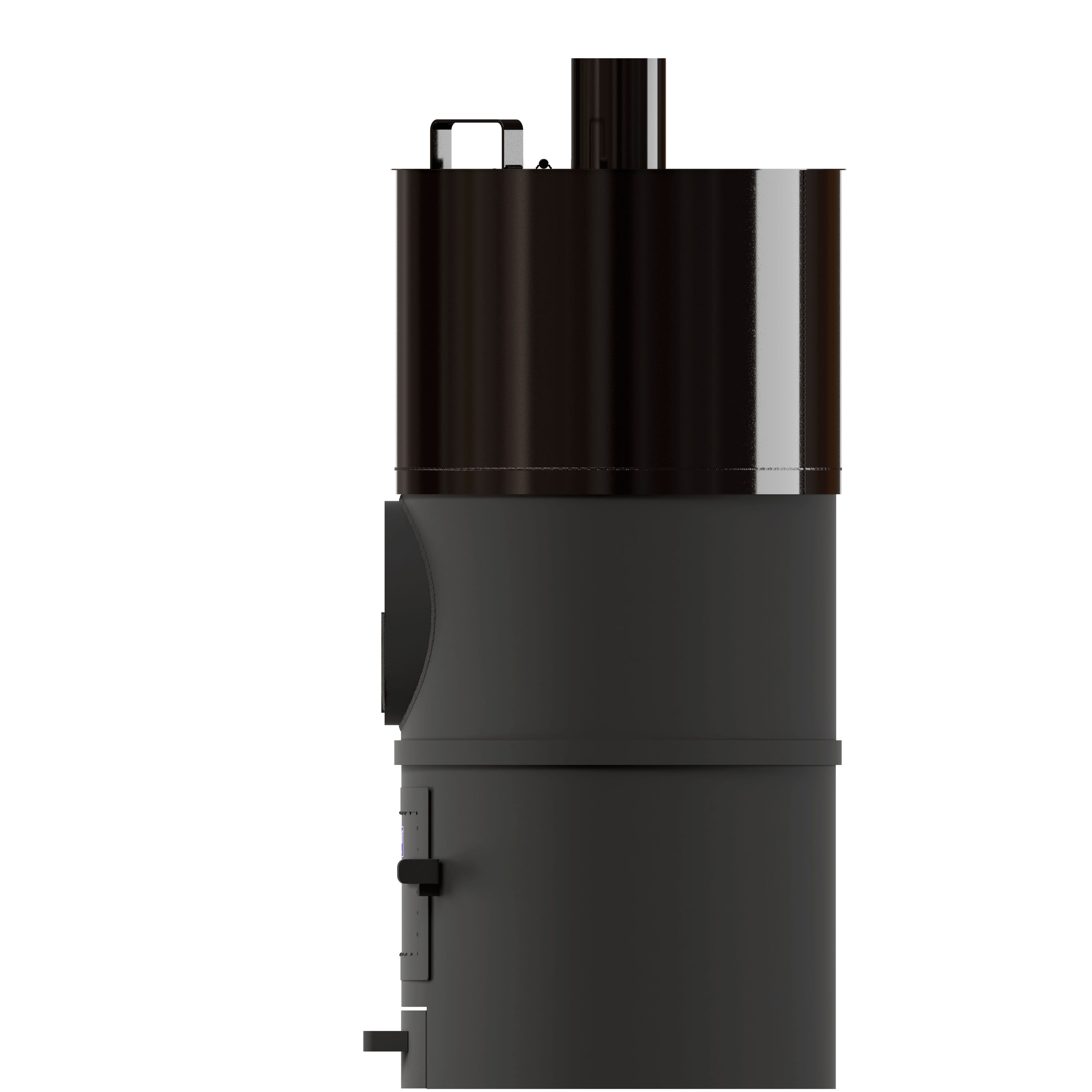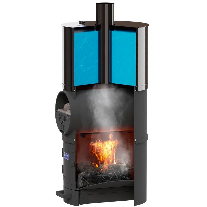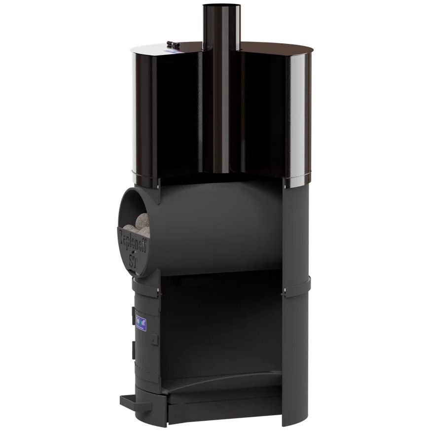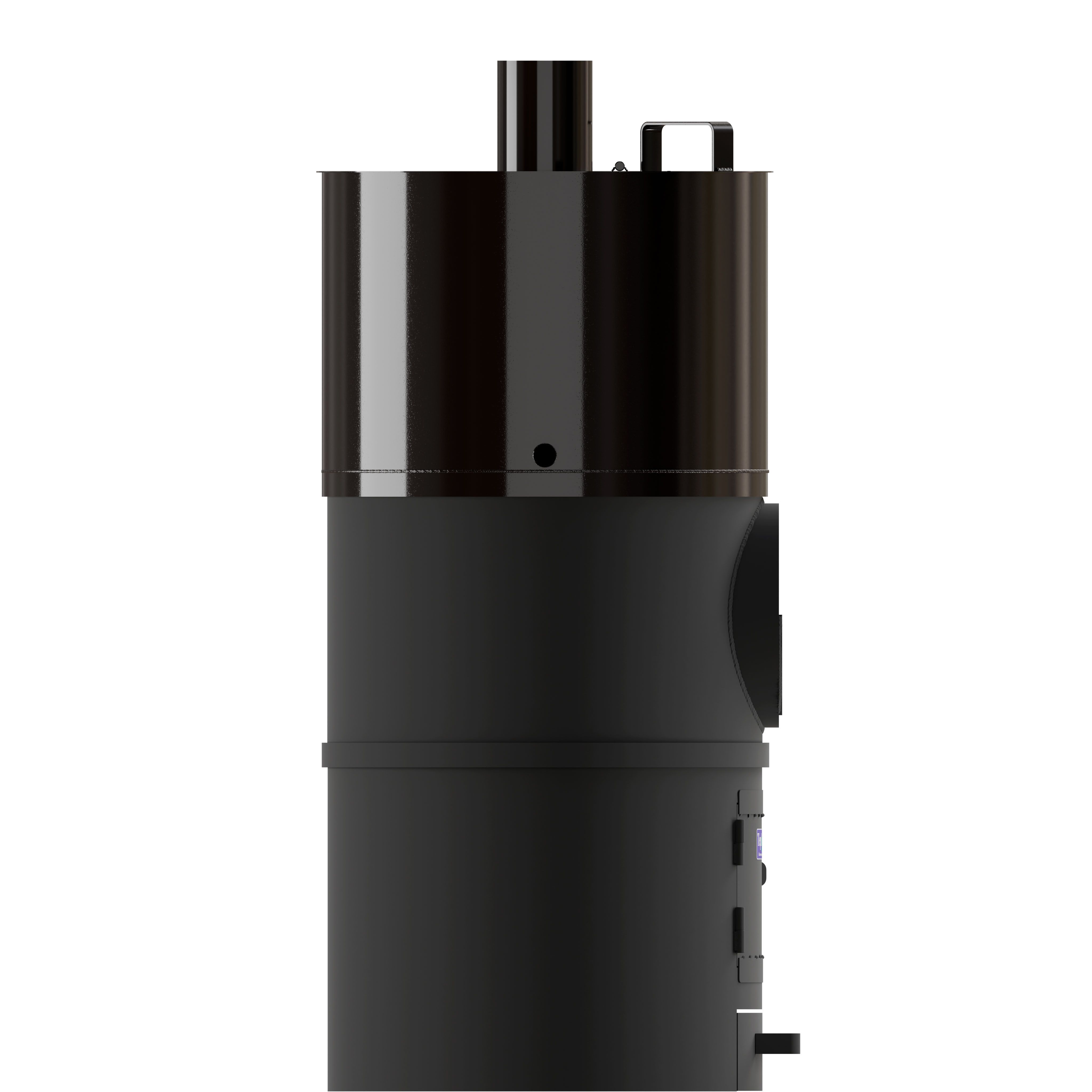 Банная печь трехкомпонентная, изготовлена из трубы 530*8, БЕЗ ВЫНОСНОЙ ТОПКИ. Водогрейный бак на 85 литров из ЧЁРНОГО МЕТАЛЛА (полимерное покрытие). Топливо – дрова, уголь.