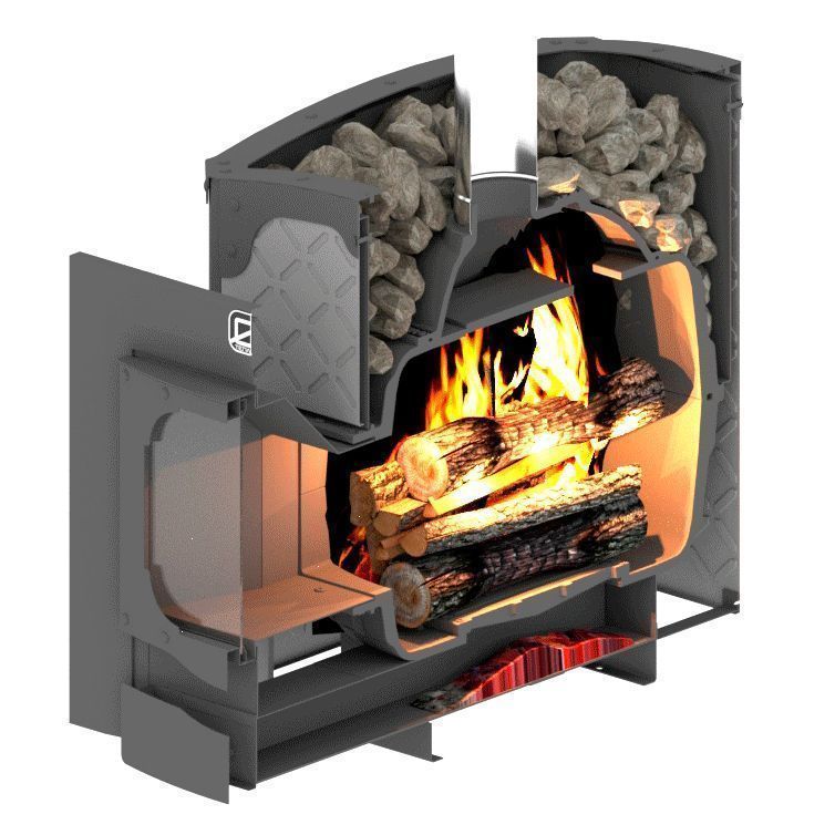 - Топка, способная вместить дрова до 43 см, и большая каменка призваны улучшить качество парения в бане.