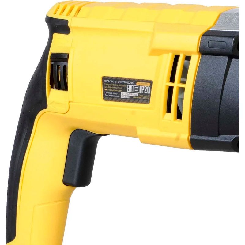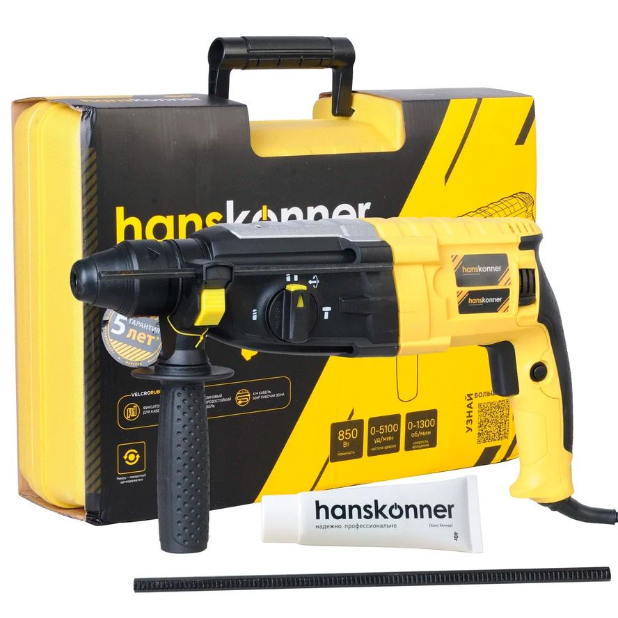Hanskonner HRH0828RE – универсальный трехрежимный перфоратор. Имеет классическую горизонтальную компоновку с продолговатым узким корпусом и небольшую массу, за счет чего максимально удобен при высотных работах, а также при эксплуатации в условиях с трудным доступом. Модель оснащена двигателем мощностью 850 Вт и усиленным вакуумно-компрессионным механизмом, развивающим энергию удара – 3.2 Дж – это позволяет уверенно бурить отверстия диаметром до 28 мм в материалах различной твердости, включая кирпичную кладку, камень и бетон, а также использовать корончатые сверла больших диаметров (до 68 мм) Универсальность применения обеспечивают три режима работы – в зависимости от конкретной задачи пользователь выбирает нужный: сверление, сверление с ударом, либо режим удара. Смена режимов происходит поворотом специального переключателя.