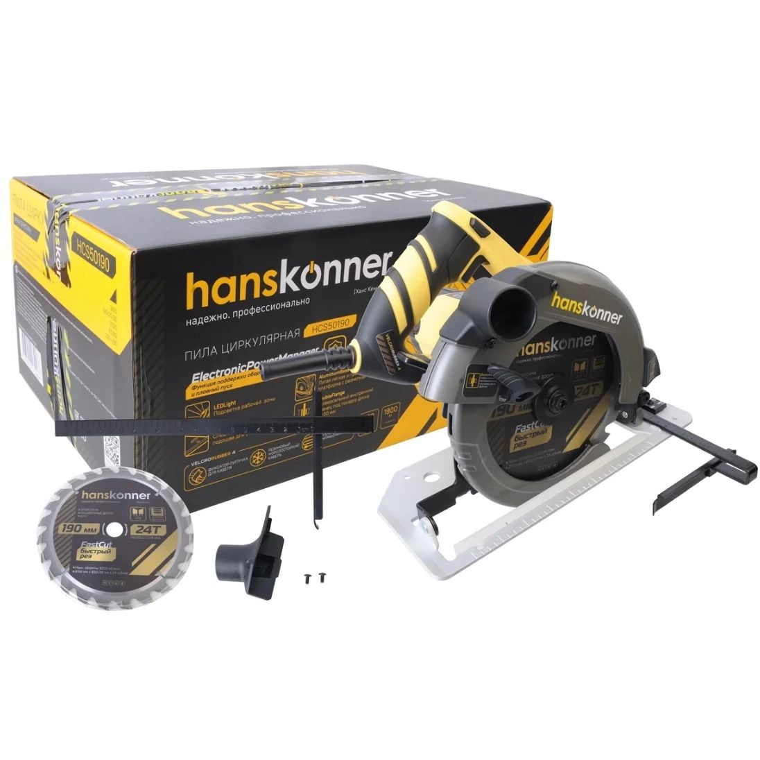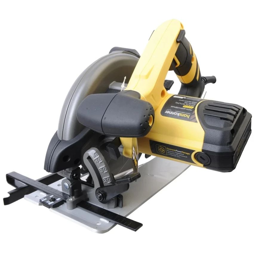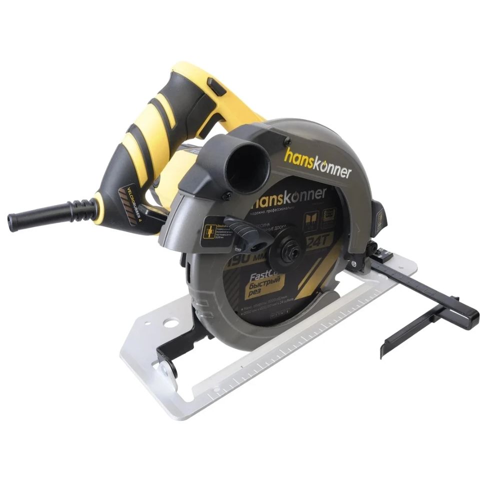 Электропила дисковая Hanskonner – надежная и производительная циркулярная пила под рабочий диаметр пильного диска 190 мм с возможностью стационарного крепления. Пила оснащена 1800 Вт электродвигателем MaxPower, высокопрочным редуктором и фирменными пылезащищенными подшипниками, благодаря чему способна выполнять больший объем работ в сравнении с бытовыми аналогами, и демонстрирует высокую эффективность не только с мягкими, но и твердыми породами древесины. Максимальная глубина пропила – 65 мм. Важная особенность модели Hanskonner HCS50190 – наличие блока константной электроники EPM (Electronic Power Manager), предотвращающего снижение рабочих оборотов под нагрузкой и обеспечивающего плавный запуск. Инструмент получил не склонную к деформации литую алюминиевую платформу, гарантирующую высокое качество производимого реза. Предусмотрена возможность точной настройки пилы на необходимую глубину пропила, а также возможность выполнения резов на угол от 0 до 45 градусов. Фиксация опорной платформы в требуемом наклонном положении осуществляется безыинструментальным способом – с помощью специального зажимного рычага, что значительно ускоряет и облегчает настройку перед работой. Для большего удобства пользователя модель имеет LED подсветку рабочей зоны, обеспечивающую отличную видимость линии реза даже при недостаточном освещении, а также функцию блокировки вала шпинделя, гарантирующую максимально быструю замену оснастки. Предусмотрена функция быстрого доступа к щеткам QuickChange, дающая возможность их быстрой замены, без демонтажа элементов корпуса. Благодаря применению сетевого кабеля 4VelcroRubber с резиновой изоляцией, в полной мере сохраняется его гибкость и эластичность в условиях низких температур. Четырехметровая длина кабеля обеспечивает рабочую зону площадью до 50 м2, а фиксатор-липучка способствует удобству хранения. Наличие патрубка позволяет подключать к инструменту строительный пылесос.