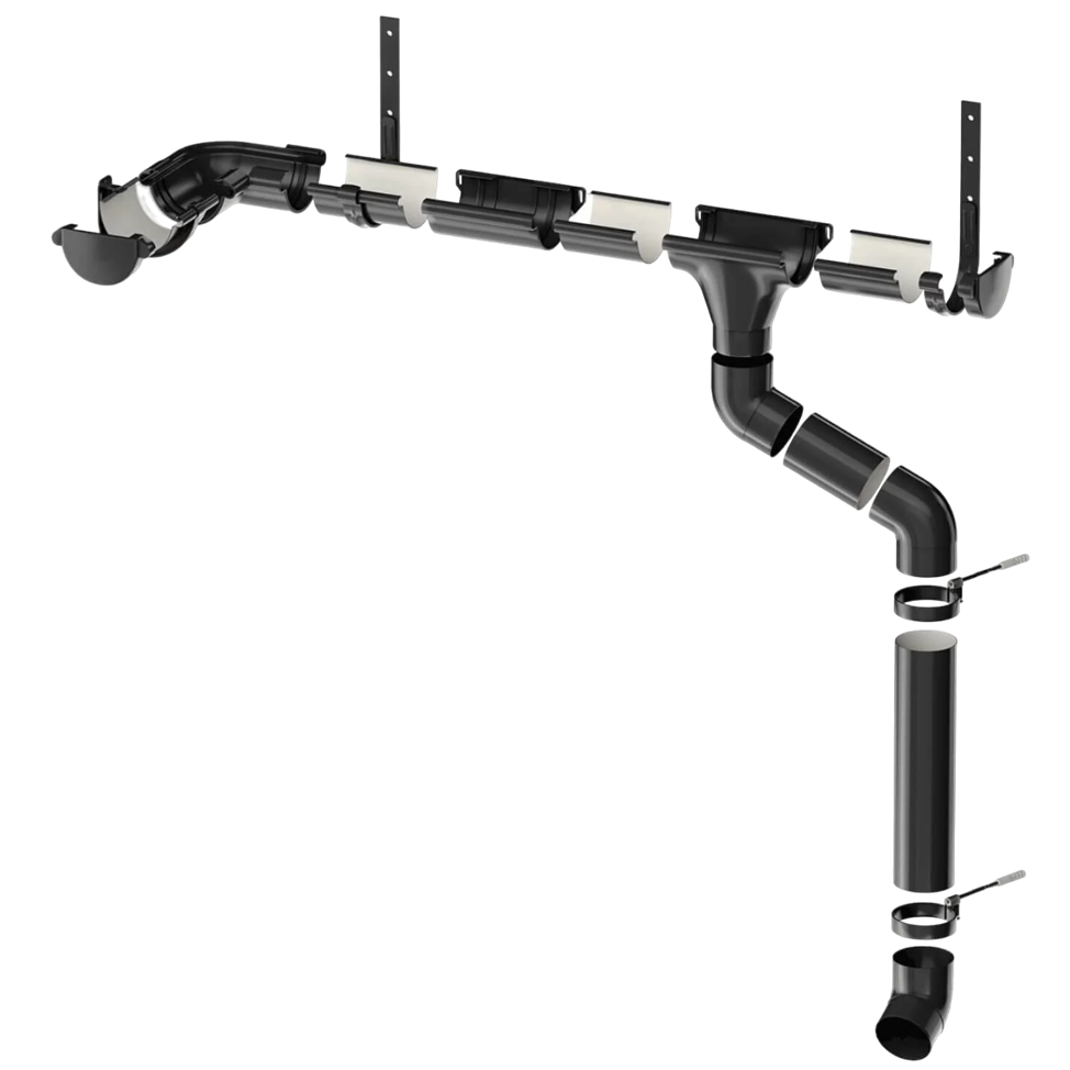 Водосточная система состоит из подвесных желобов и труб. Кроме того, в нее входят дополнительные элементы: воронки, защитные сетки, кронштейны, хомуты, держатели, муфты, угловые элементы и другое. В желоб поступает вода, попадает в воронку и стекает по трубам. Воронка соединяется с трубой с помощью колена, которое может иметь разные градусы угла.