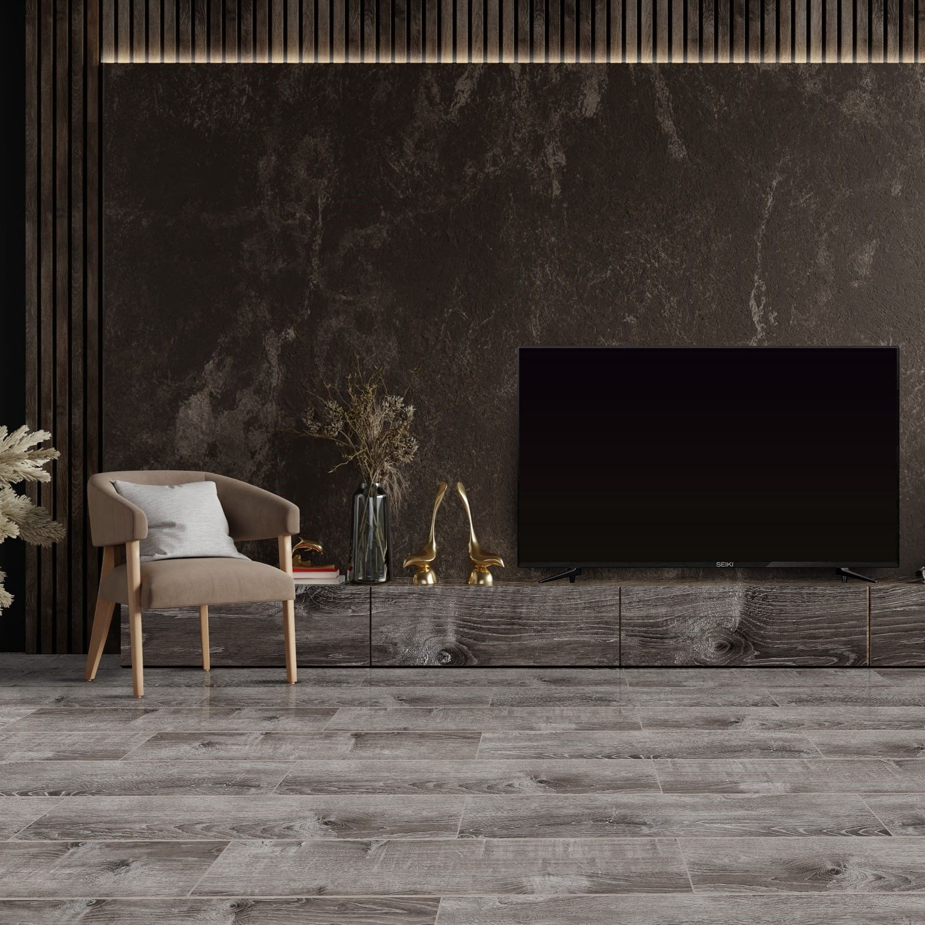 - Серые и коричневые оттенки и V-образная фаска создают ощущение натурального пола из дерева, а также не требуют особого ухода.