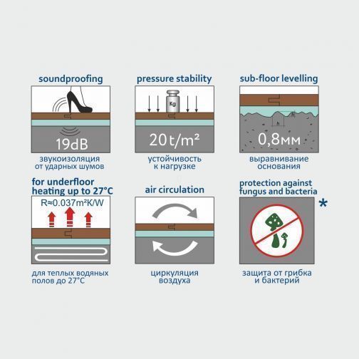 - Мягкий материал защищает напольное покрытие от ударных нагрузок при ходьбе, обеспечивает дополнительную тепло-и звукоизоляцию;