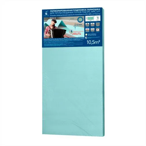 Перфорированная подложка-гармошка для теплого пола.Подложка-гармошка зелёная, отличается от листовой тем, что все листы скреплены между собой. При этом она складывается как рулонная и значительно экономит время на укладку. Подложка имеет антибактерицидные и противогрибковые свойства.
