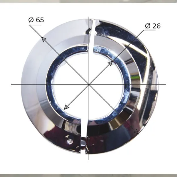 Разъемный отражатель используется для монтажа настенных полотенцесушителей в качестве защитного и декоративного элемента. Плоской конструкцией можно замаскировать соединения с трубопроводом, а долговечное хромированное покрытие отлично впишется в интерьер ванной комнаты.