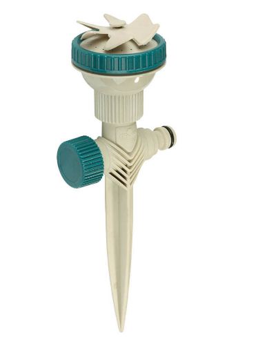 Два соединительных гнезда позволяют создать цепочку из поливочных распылителей. Лепестковая конструкция обеспечивает более равномерный полив. Пластиковая пика надежно фиксирует распылитель на почве.