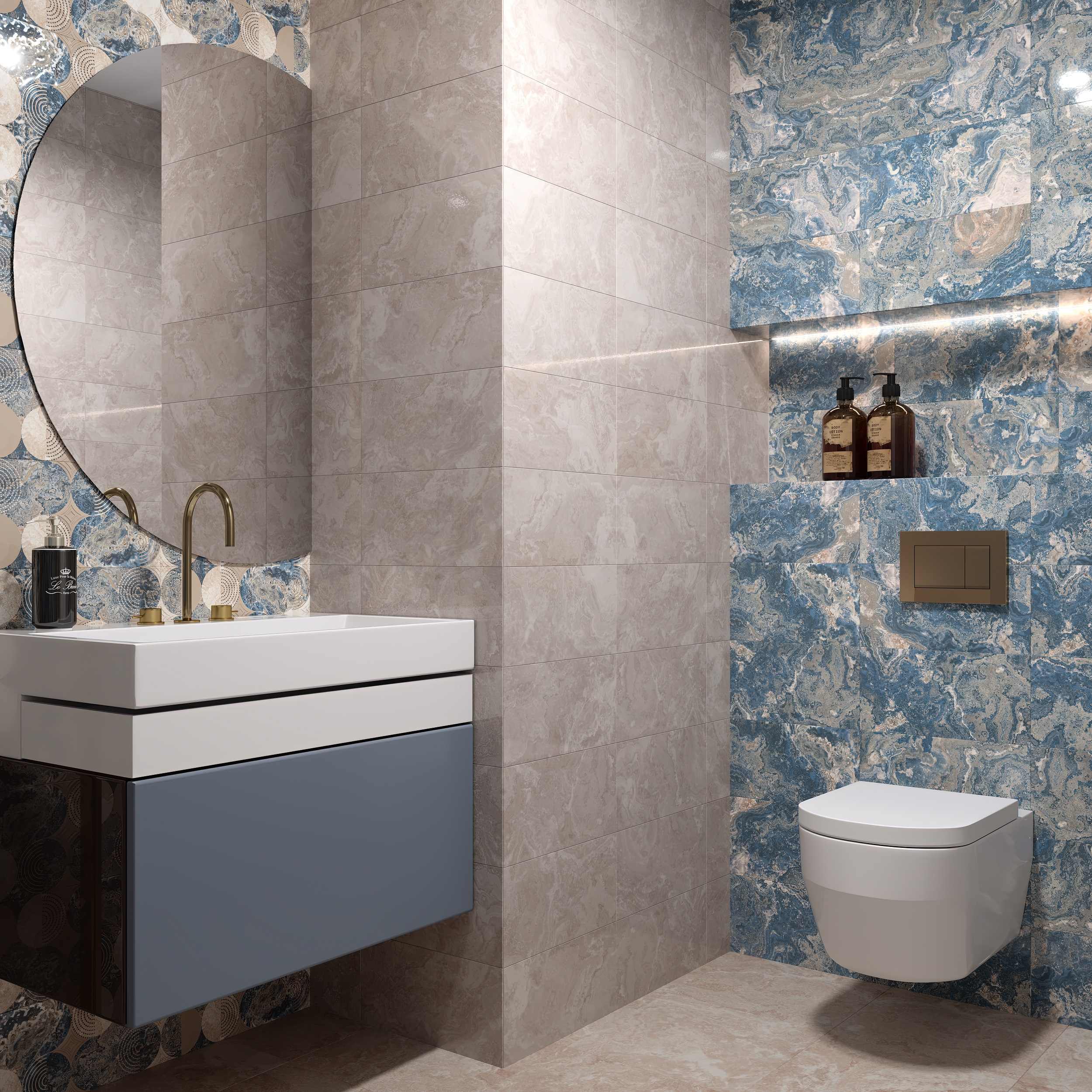 Крупноформатная керамическая плитка Ричмонд торговой марки Axima приковывает внимание потрясающей имитацией выразительного рисунка гранита Golden Persa. Фоновая плитка для стен производится не только в естественных для этой породы коричнево-бежевых тонах, но и в фантазийно-синем исполнении. Эффектные декоративные вставки с незаконченными окружностями привнесут хай-тек акцент в дизайн вашего помещения. Напольная плитка коллекции Ричмонд — матовая, она выполнена в двух цветовых решениях: коричневом и бежевом.