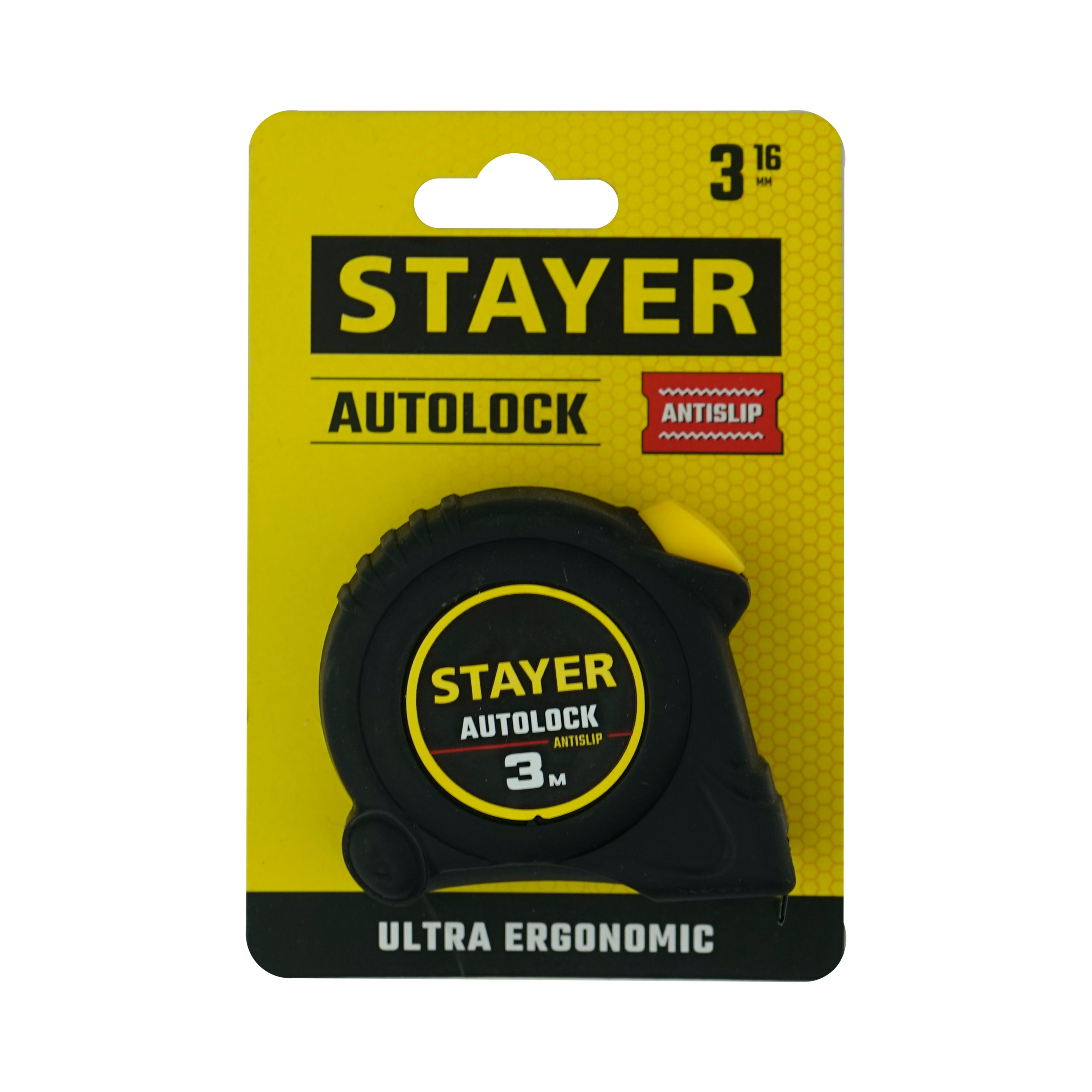 Рулетка Мастер аутлок STAYER, 3мх16мм (2-34126-03-16) с автоматической фиксацией полотна для повышения удобства измерений.