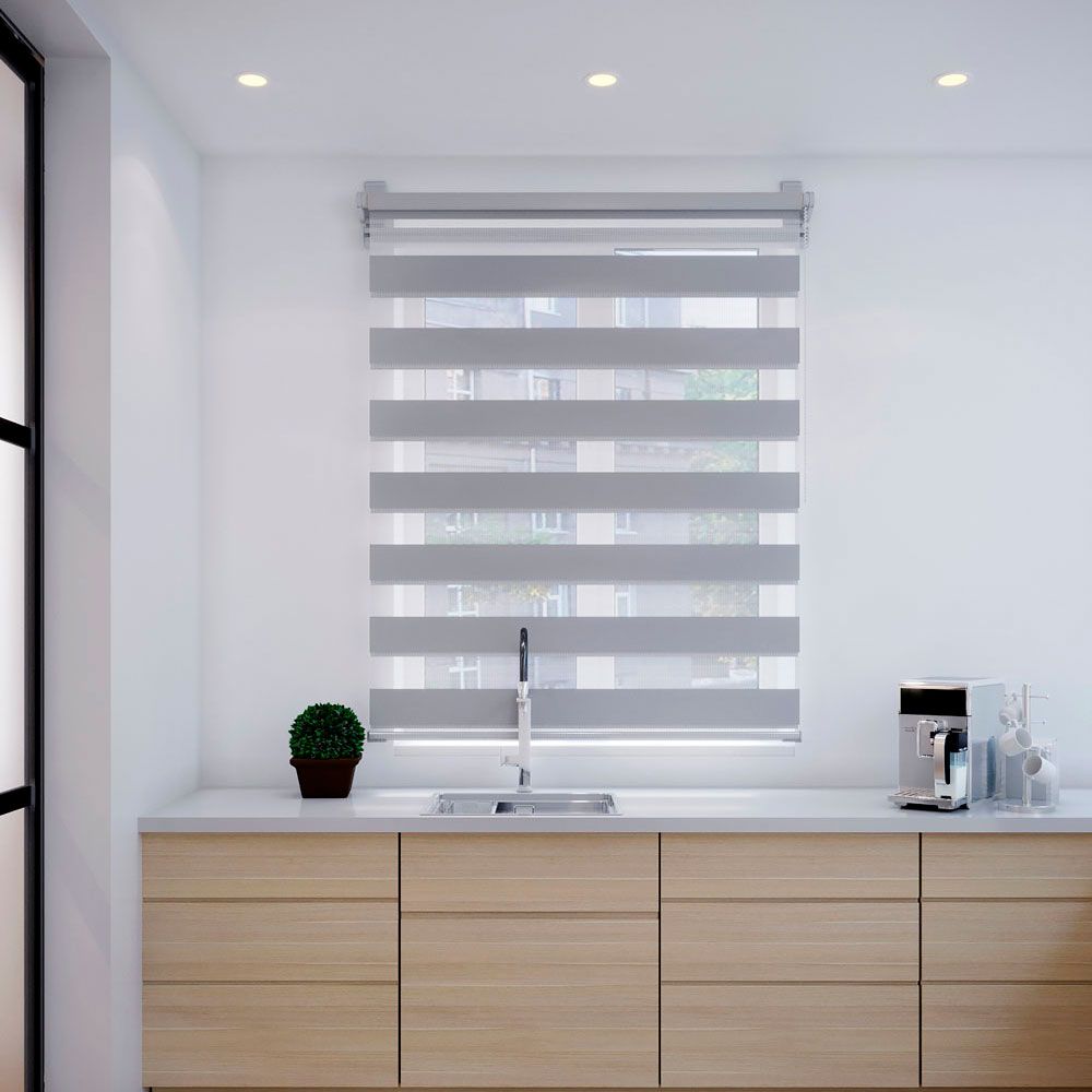 Рулонные шторы – это современное функциональное решение, закрывающее потребности в светозащите и декоре окна. Рулонные шторы день-ночь представляет собой чередование двух фактур: прозрачной сетки и жаккардовой ткани. Управление такими шторами – это занимательная игра светом. Если декоративная ткань перекрывает полосы сетки, формируется режим ночь, при полном совмещении каждой из фактур по отношению друг к другу – штора открыта в режиме день.