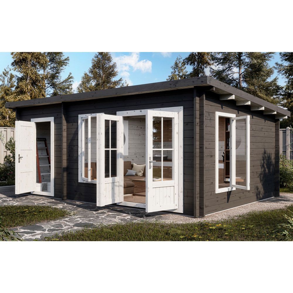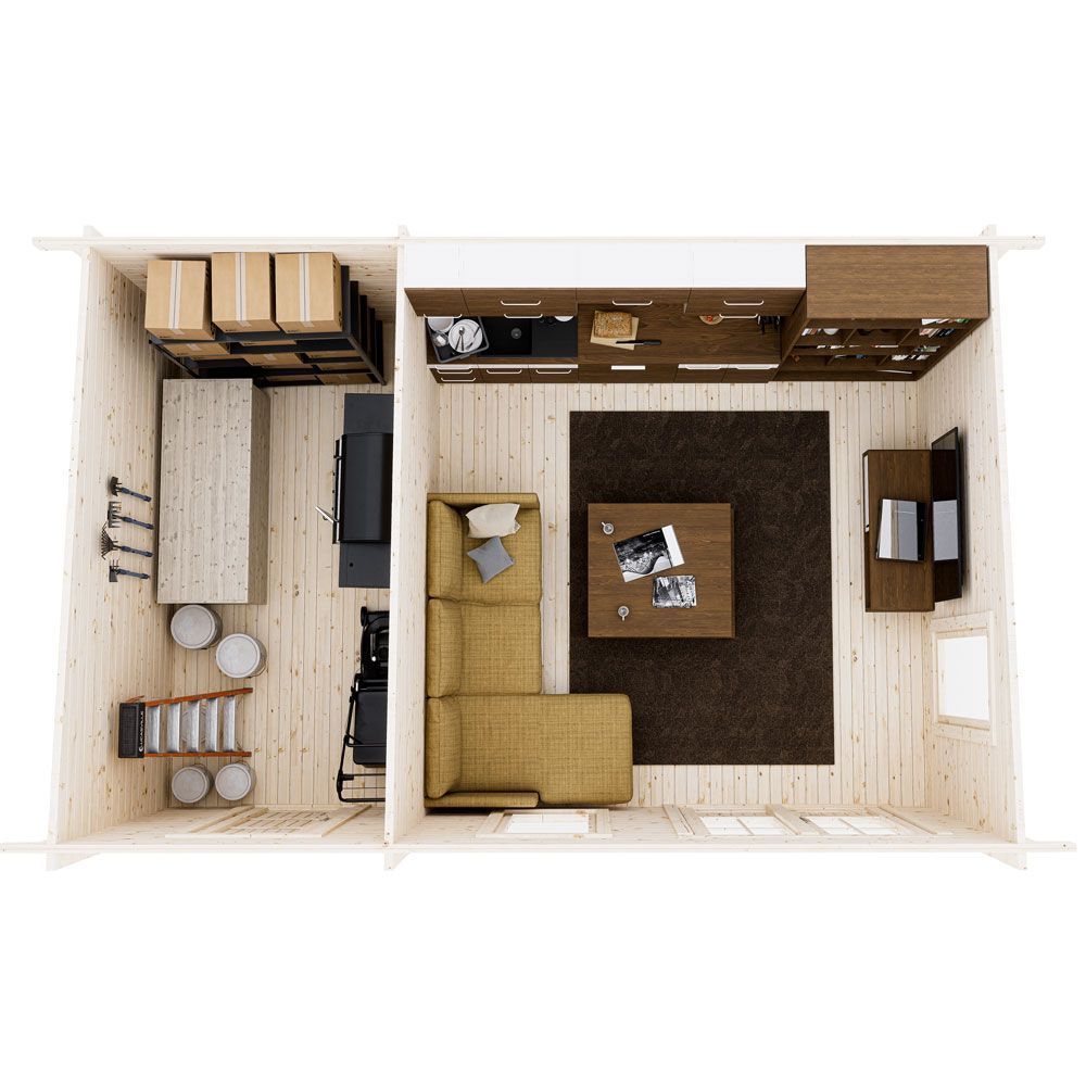 Садовый дом размером 5,8х4,2 м с общей площадью 21,5 м² разделен на две функциональные зоны: просторное помещение площадью 14,6 м², идеально подходящее для создания уютной гостиной, столовой или игровой, и хозблок площадью 6,9 м² с глухой дверью, который обеспечит надежное хранение всего необходимого, скрывая его от любопытных глаз.