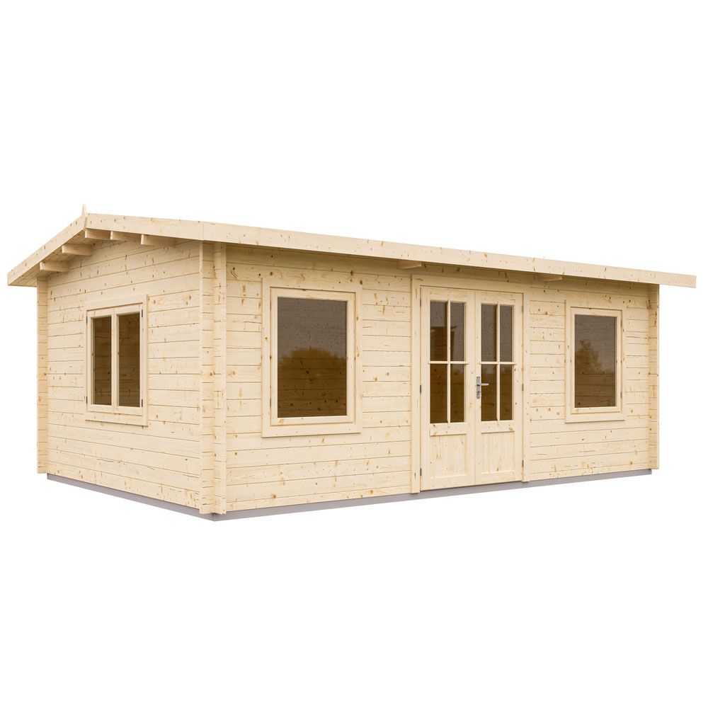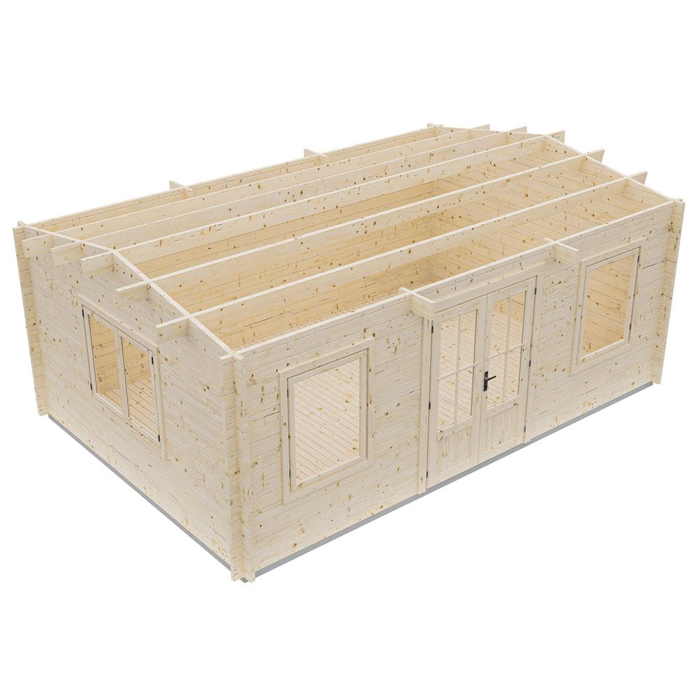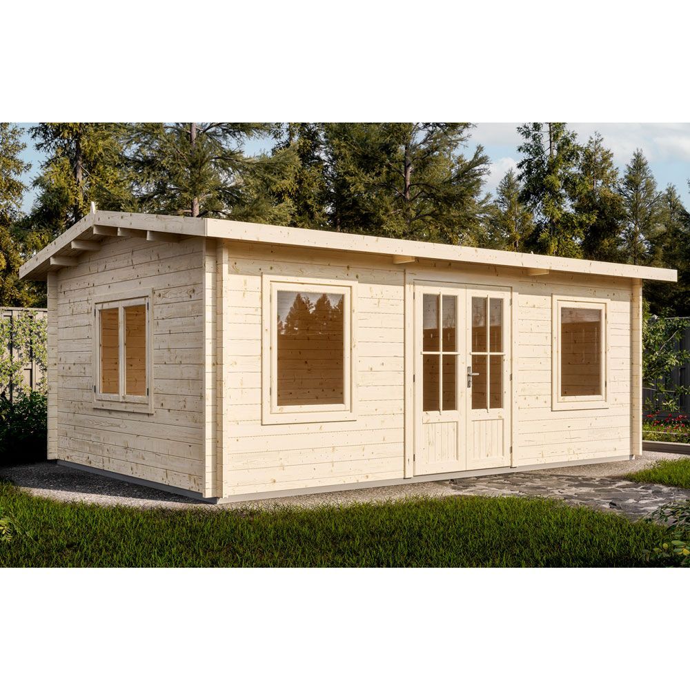 Садовый дом классической конструкции размером 6×4 м со скатной крышей и общей площадью 21,2 м² позволяет с комфортом обустроить внутреннее пространство, а три окна и остеклённые двери обеспечивают естественное освещение помещений, создавая приятную и светлую атмосферу.