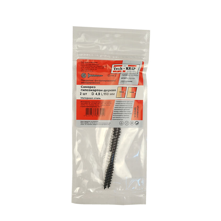 Саморез ШСГД 4,8х150мм - стальной крепежный элемент, фосфатированный, с острым наконечником, потайной головкой, крестообразной формой шлица Ph2, крупной резьбой, черного цвета