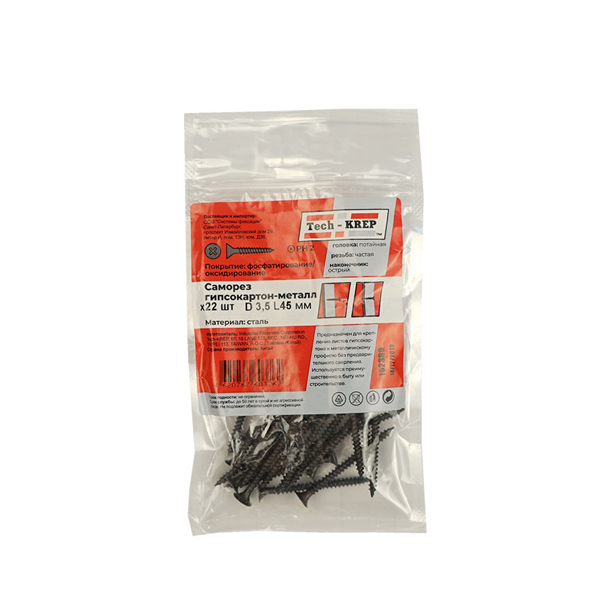Саморез ШСГМ 3,5х45мм - стальной крепежный элемент, фосфатированный, с острым наконечником, потайной головкой, крестообразной формой шлица Ph2, частой резьбой, черного цвета.