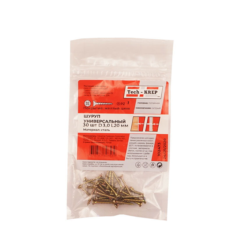 Саморез ШУж 3,0х20мм имеет потайную головку, крестообразный шлиц, острый наконечник и крупную резьбу. Выполнен из углеродистой стали, покрытие – желтый цинк.