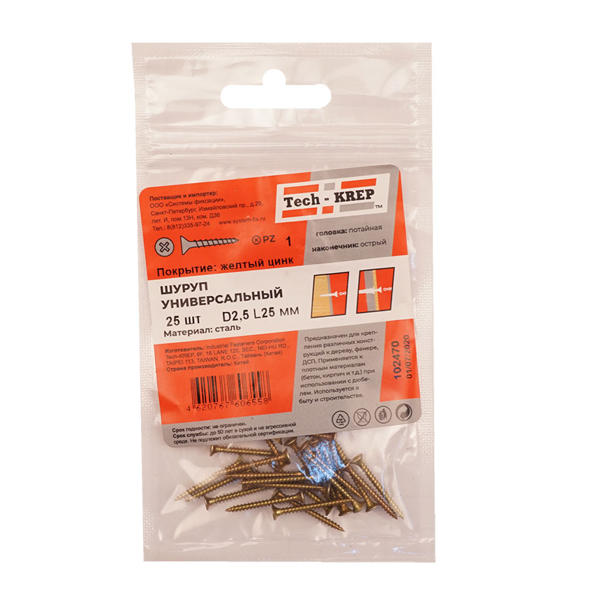 Саморез ШУж 2,5х25мм имеет потайную головку, крестообразный шлиц, острый наконечник и крупную резьбу. Выполнен из углеродистой стали, покрытие – желтый цинк.