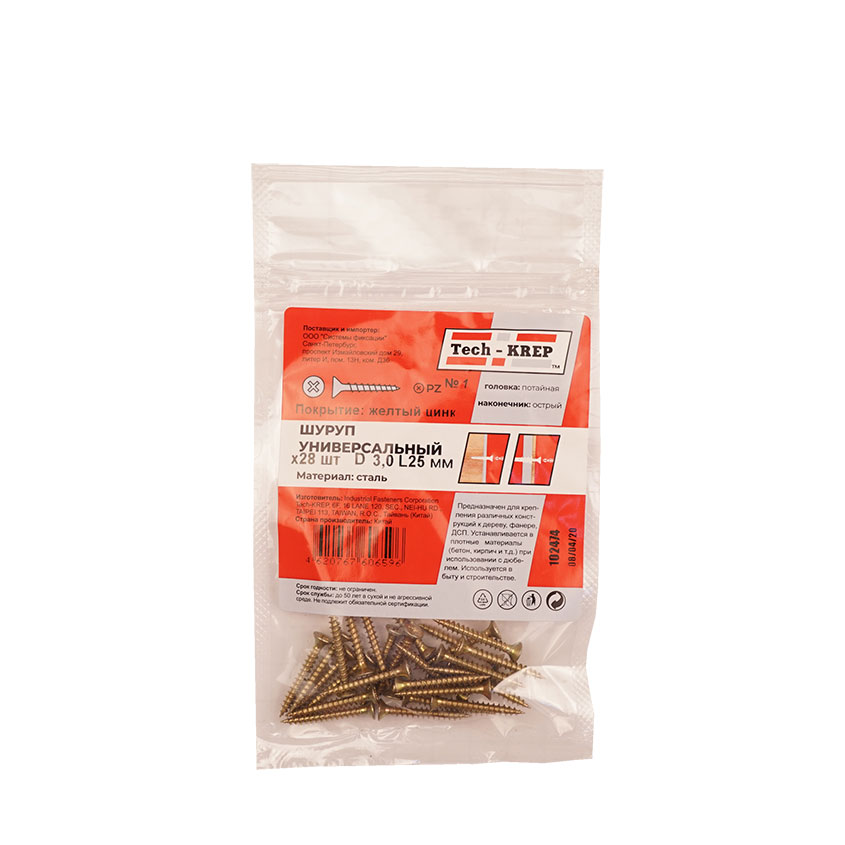 Саморез ШУж 3,0х25мм имеет потайную головку, крестообразный шлиц, острый наконечник и крупную резьбу. Выполнен из углеродистой стали, покрытие – желтый цинк.