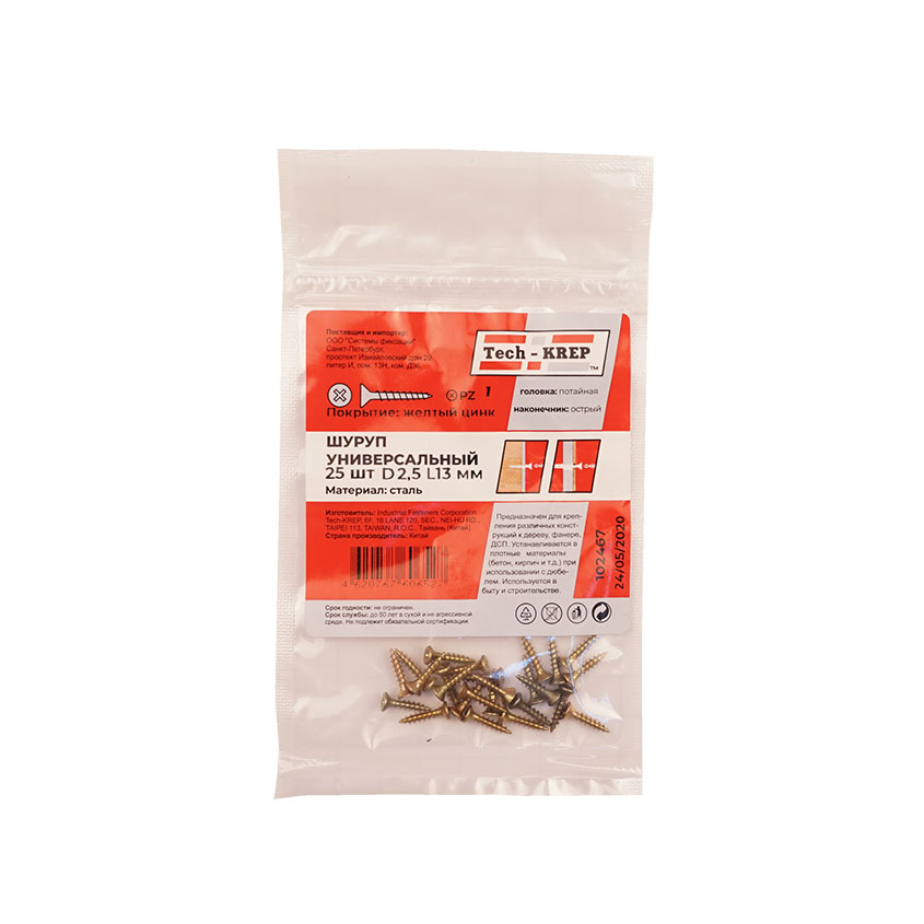 Саморез ШУж 2,5х13мм имеет потайную головку, крестообразный шлиц, острый наконечник и крупную резьбу. Выполнен из углеродистой стали, покрытие – желтый цинк.